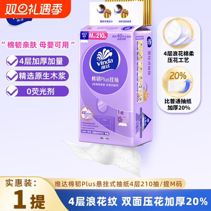 维达悬挂式抽纸M码4层210抽1提卫生纸巾家用壁挂餐巾纸实惠面巾纸
