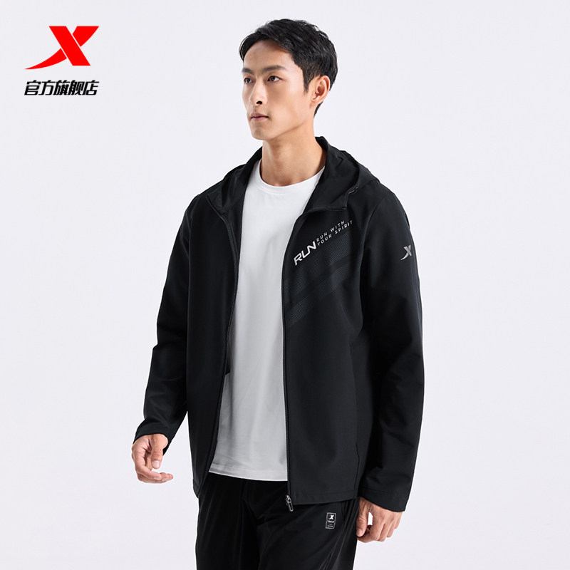 特步防泼水夹克外套男春秋季户外风衣连帽黑色上衣防风运动训练服