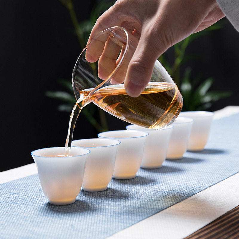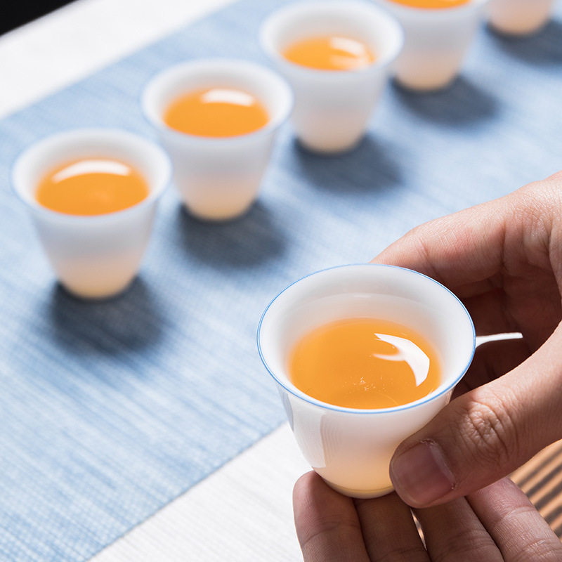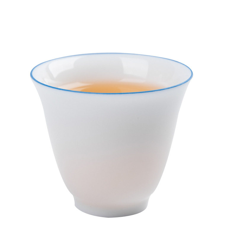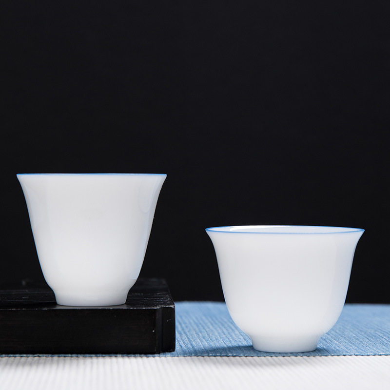 德化白瓷玉泥功夫茶杯陶瓷茶具品茗杯蓝边简约主人杯单杯小杯子