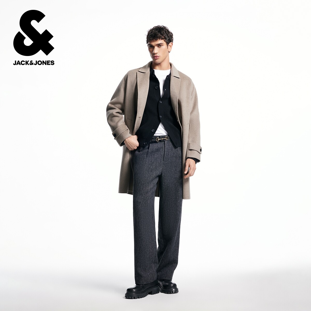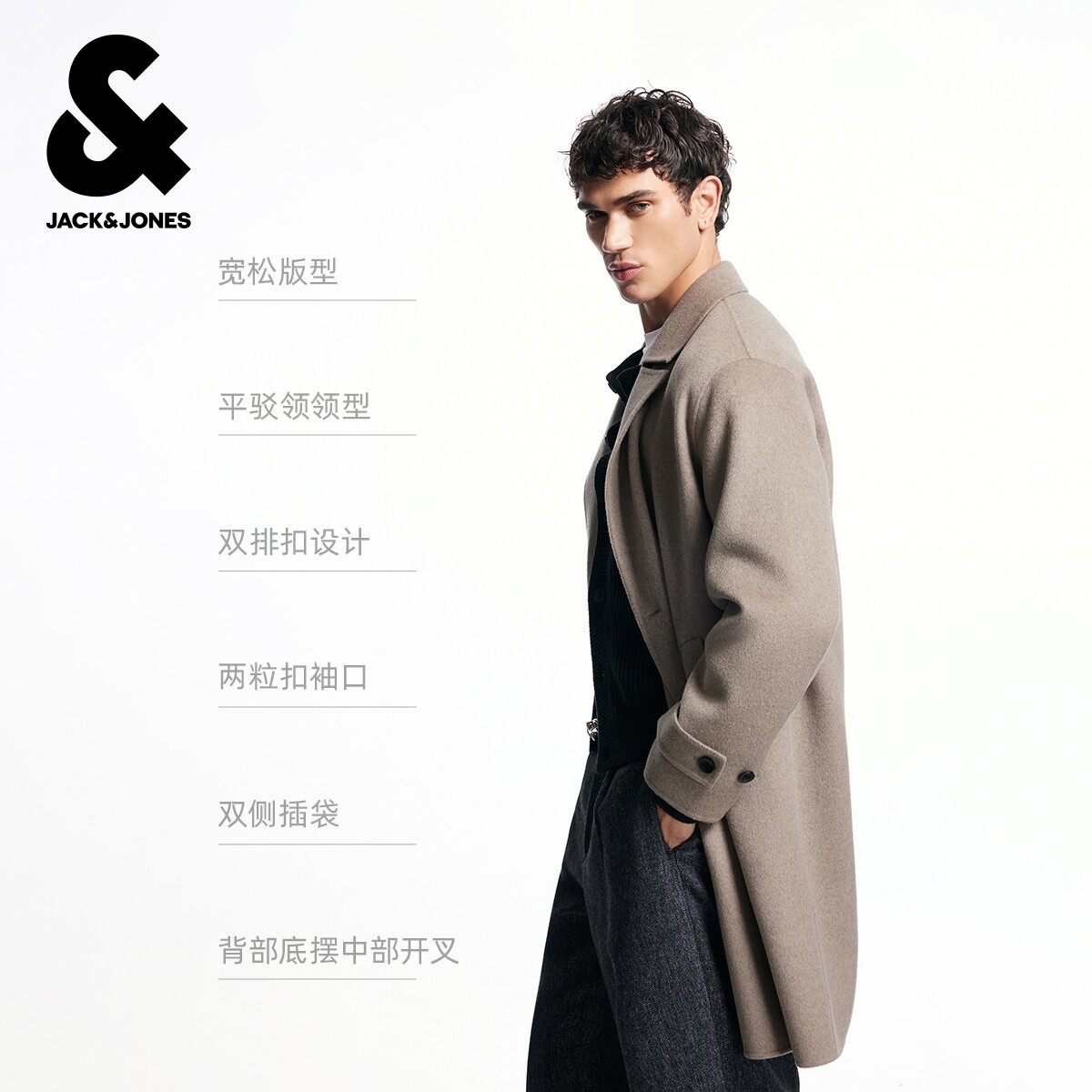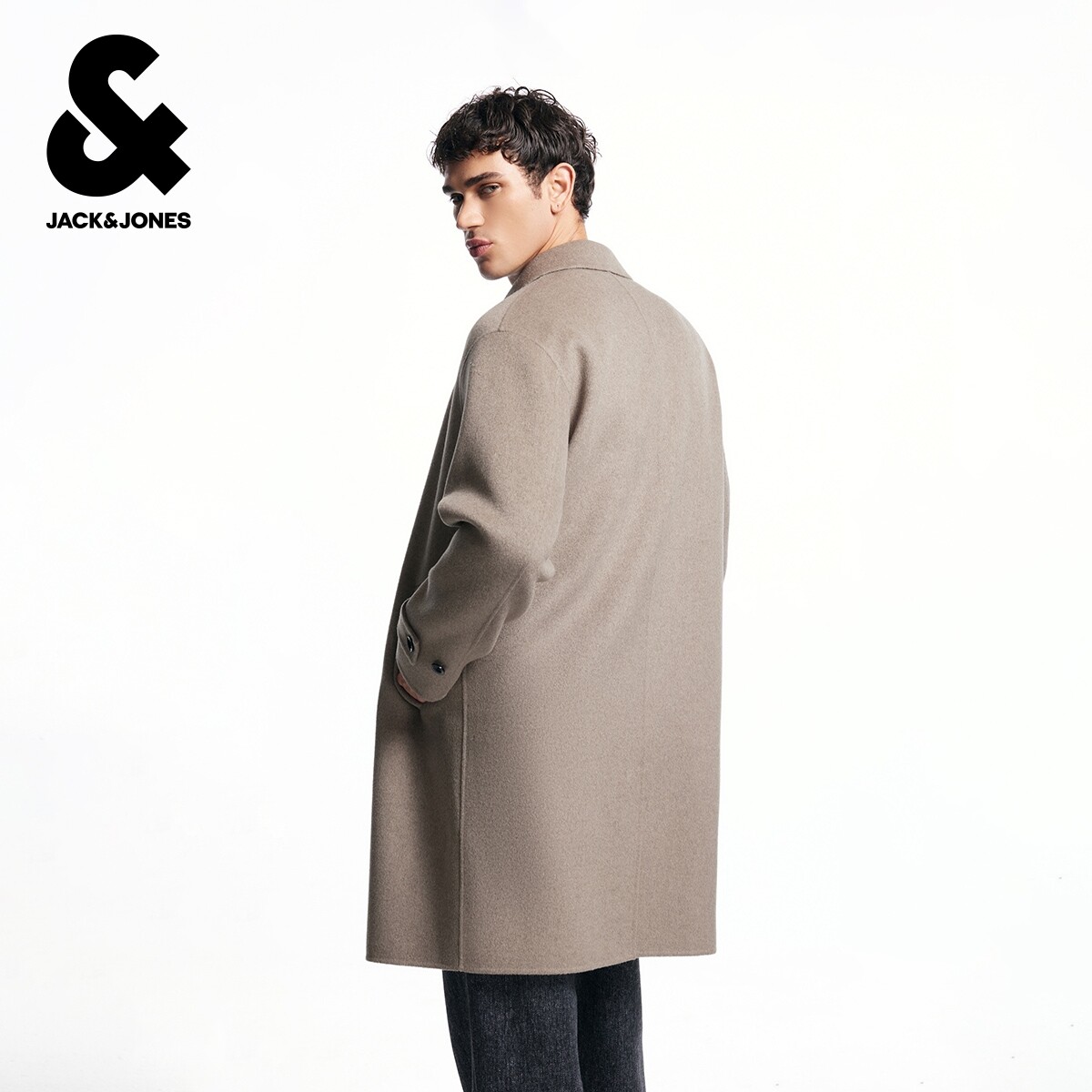 杰克琼斯奥特莱斯男装士春秋新款毛呢大衣长袖宽松潮流平驳领上衣
