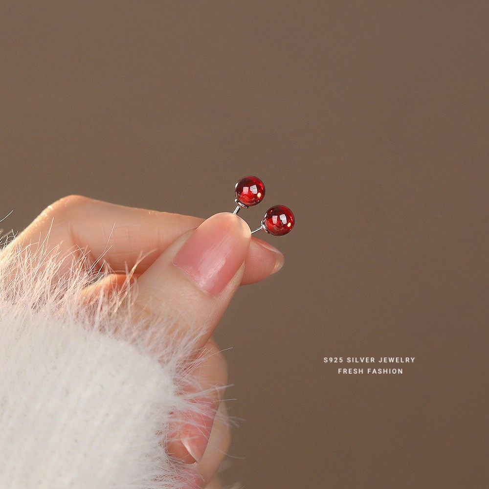 S925纯银石榴石耳钉女简约百搭气质耳环红色2025年新款养耳饰品