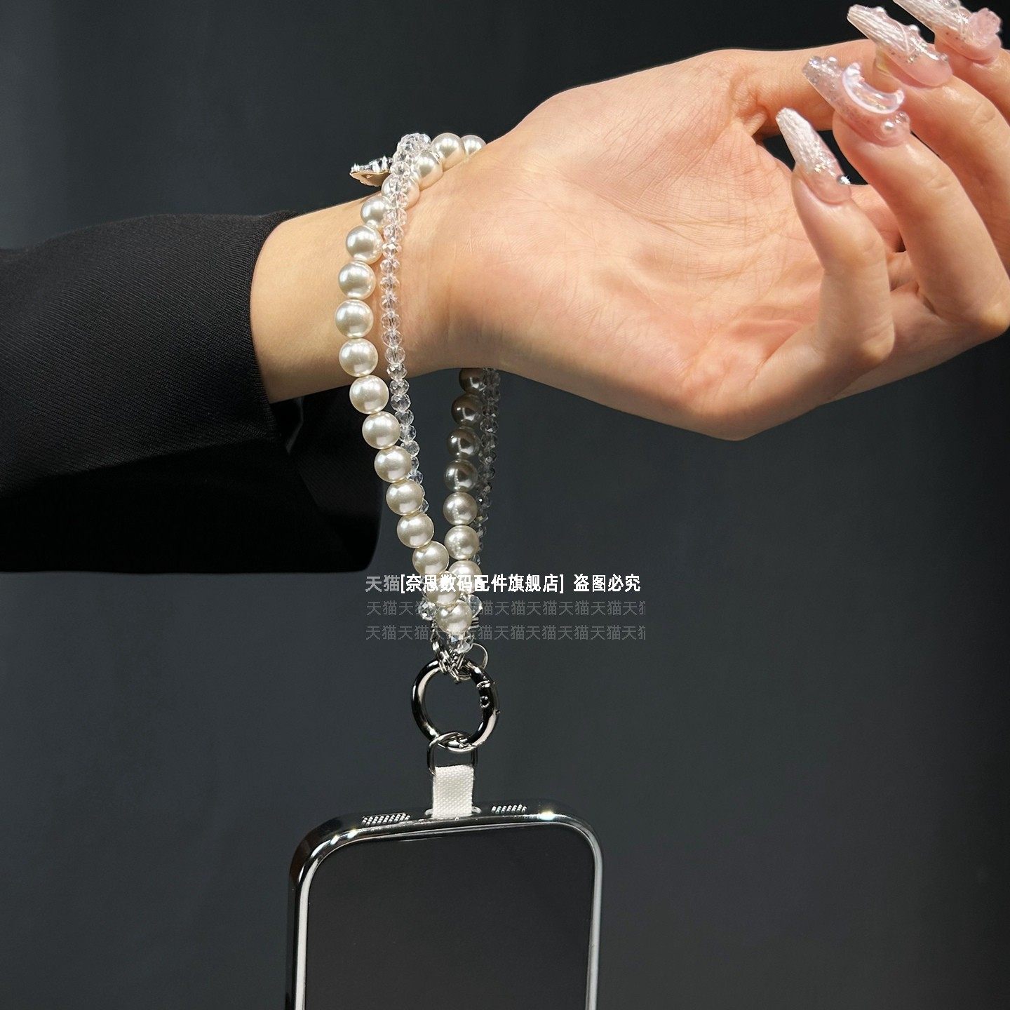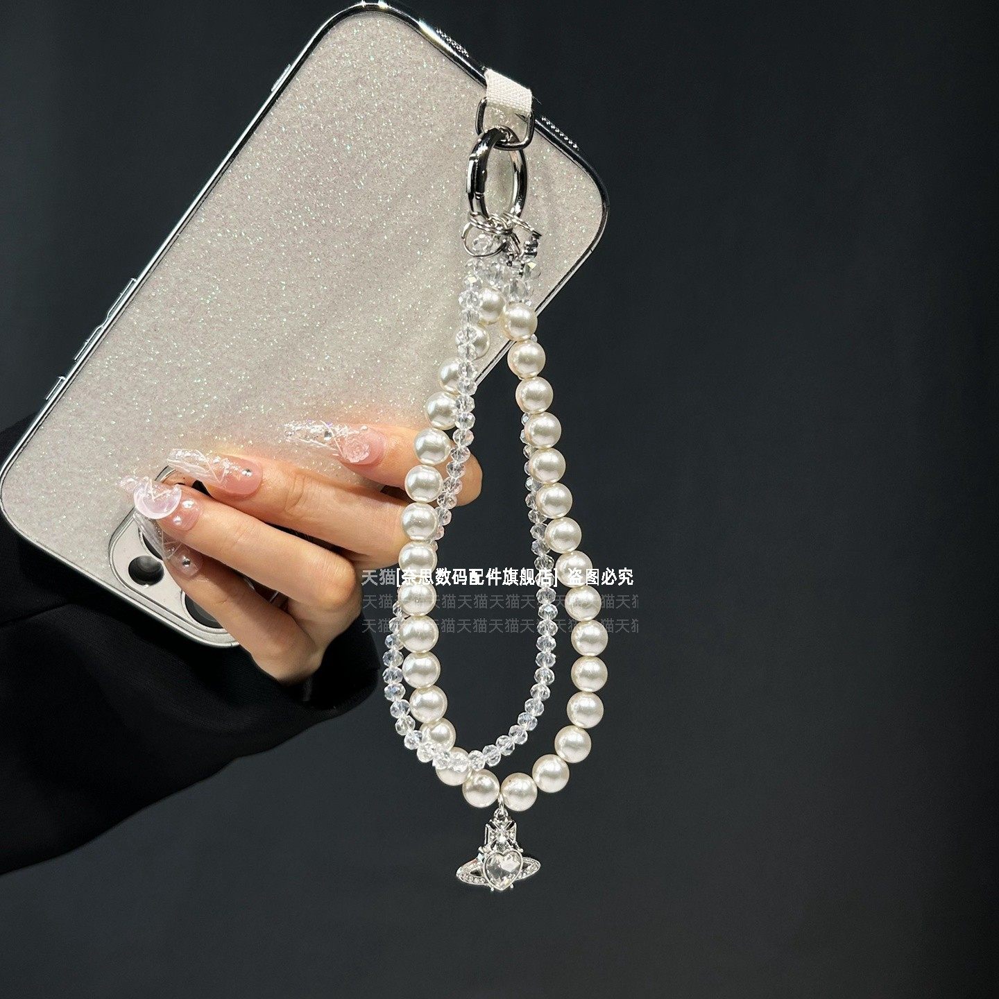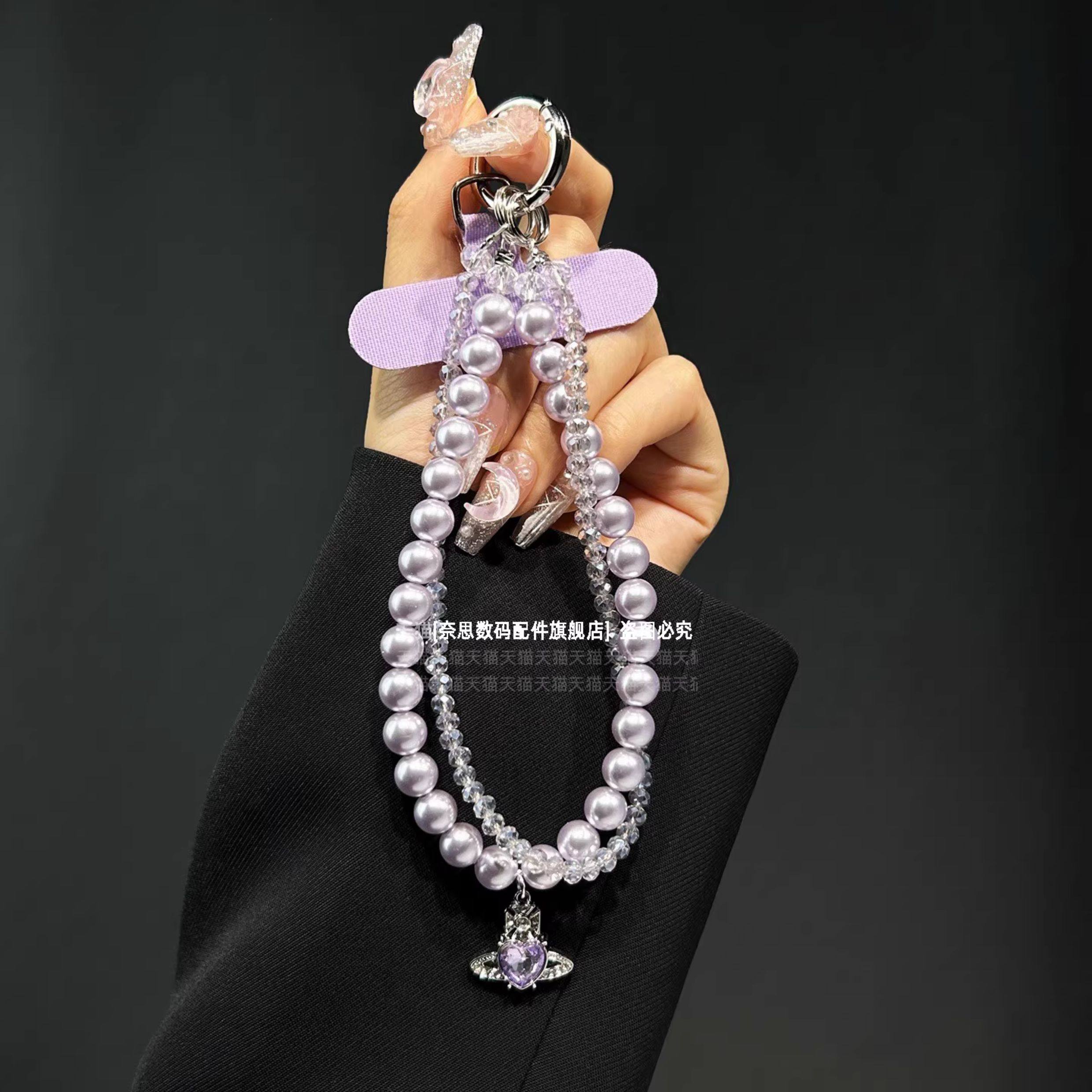 大牌珍珠手机链时尚爆款挂件创意水晶双层防摔手链精致闪钻土星吊坠潮牌网红高级小众挂链挂手腕链条钥匙包壳