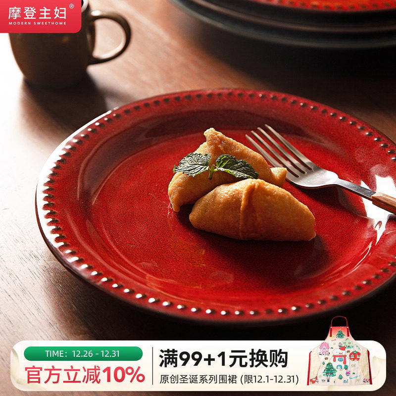 摩登主妇红色盘子家用碟子高级感新年餐具陶瓷意面西餐盘牛排餐盘