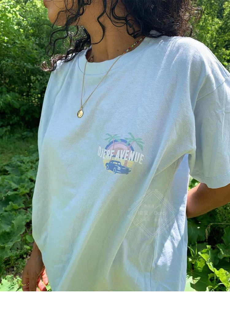 ins美式复古夏威夷度假风椰树字母小汽车做旧印花甜美棉学生潮T恤