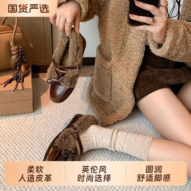加绒小皮鞋女2025秋冬新款毛毛鞋豆豆乐福鞋单鞋保暖棉鞋防水黑色
