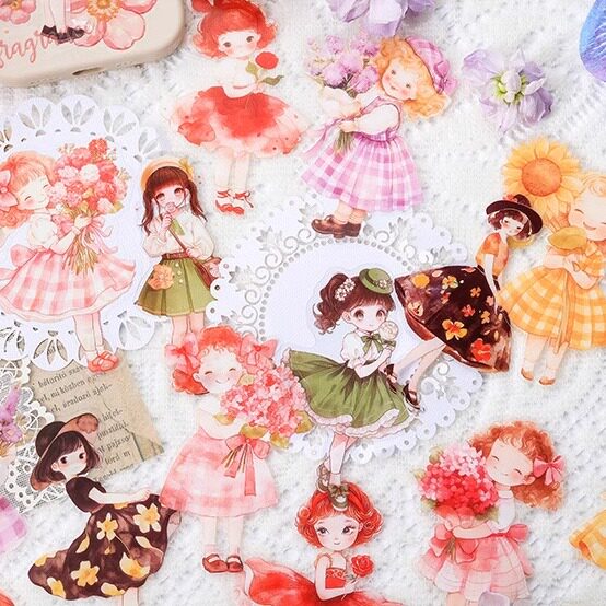 PET贴纸雅静如兰鲜花少女孩甜美可爱人物DIY手机壳手帐谷美素材料