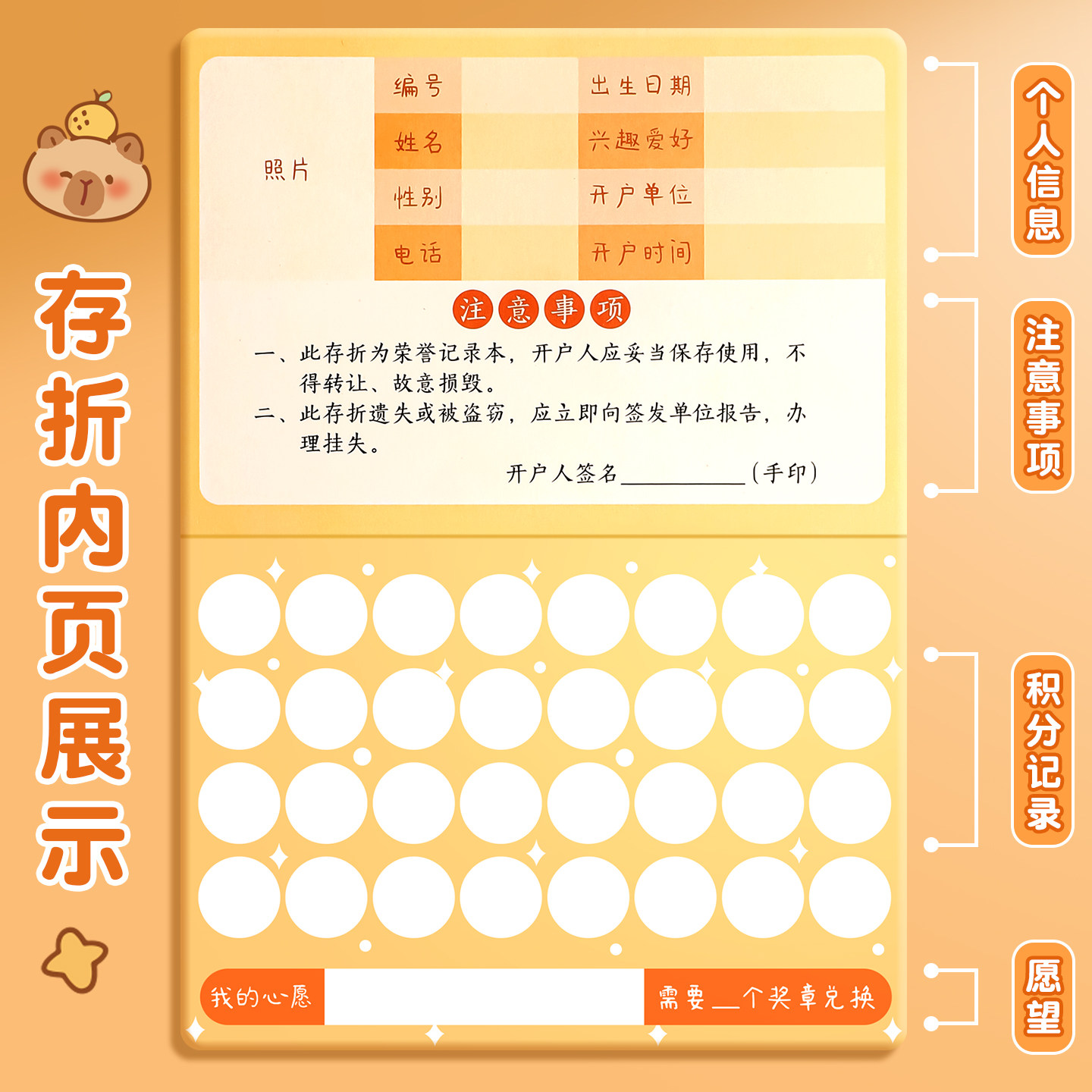 卡皮巴拉心愿存折本小学生奖励积分卡小红花收集本幼儿园印章存折盖章本儿童奖励表扬专用