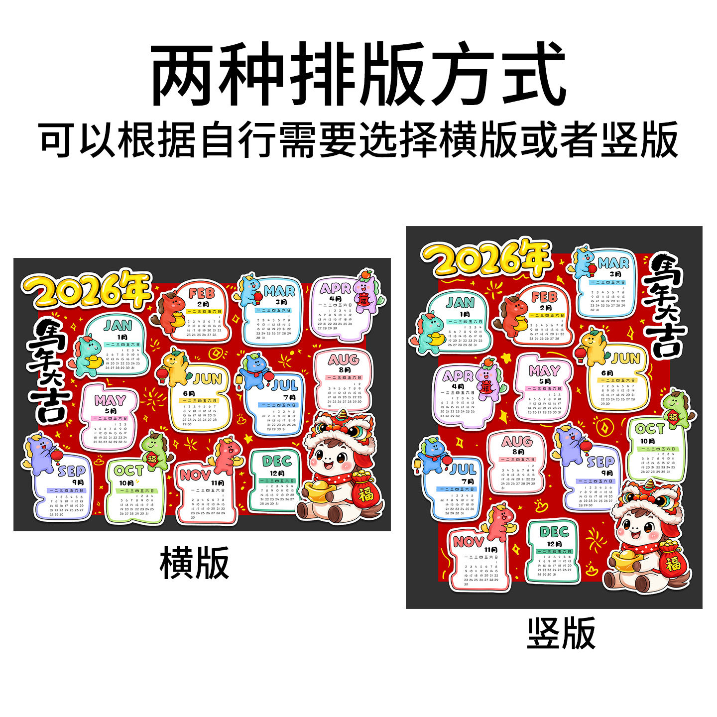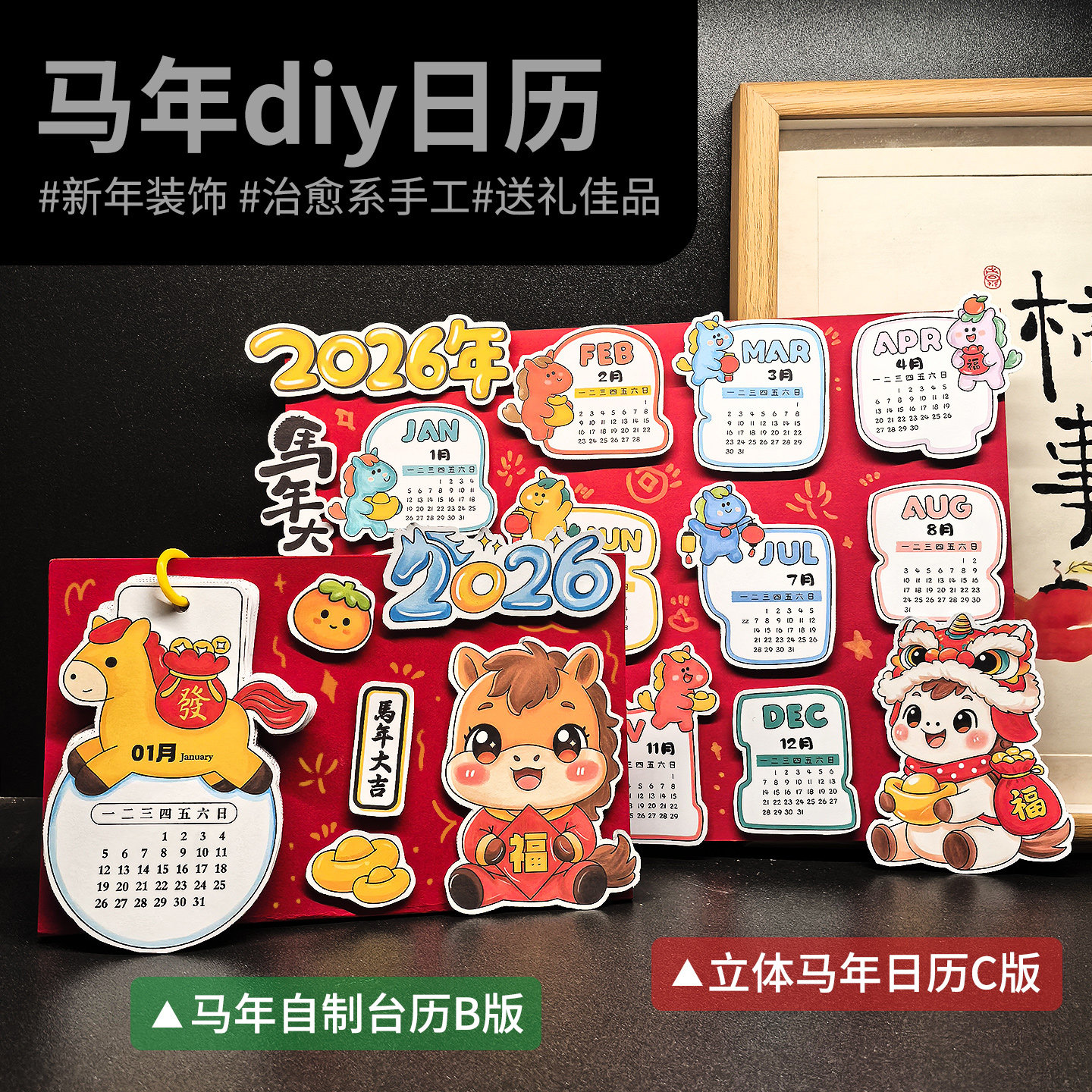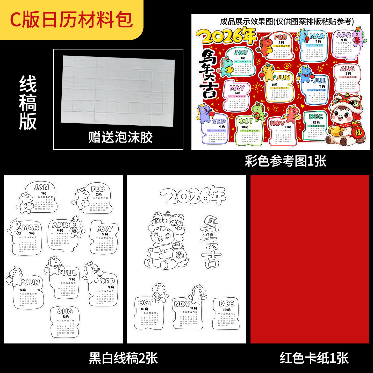 2026马年新年日历立体儿童画春节手抄报涂色半成品线稿手工材料包