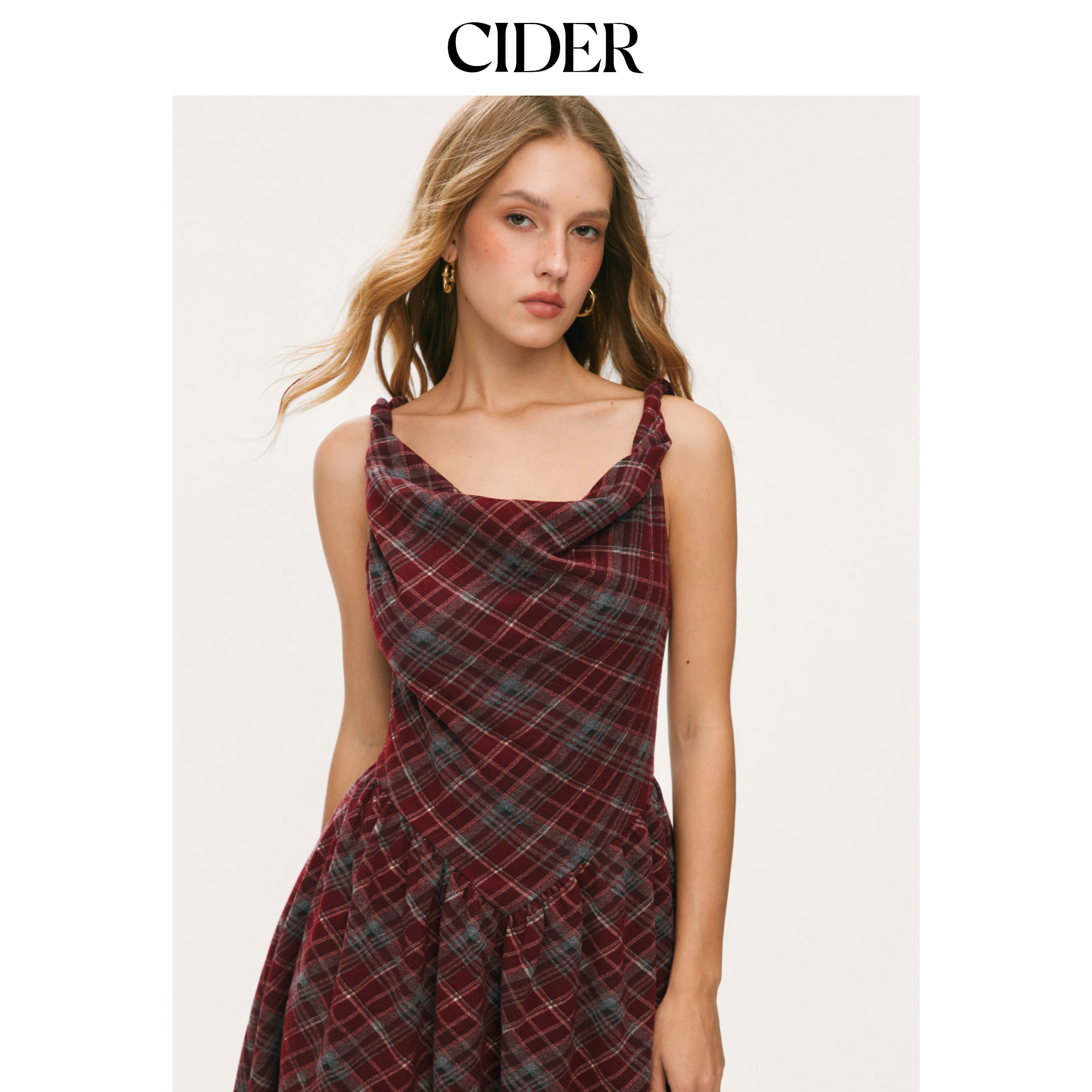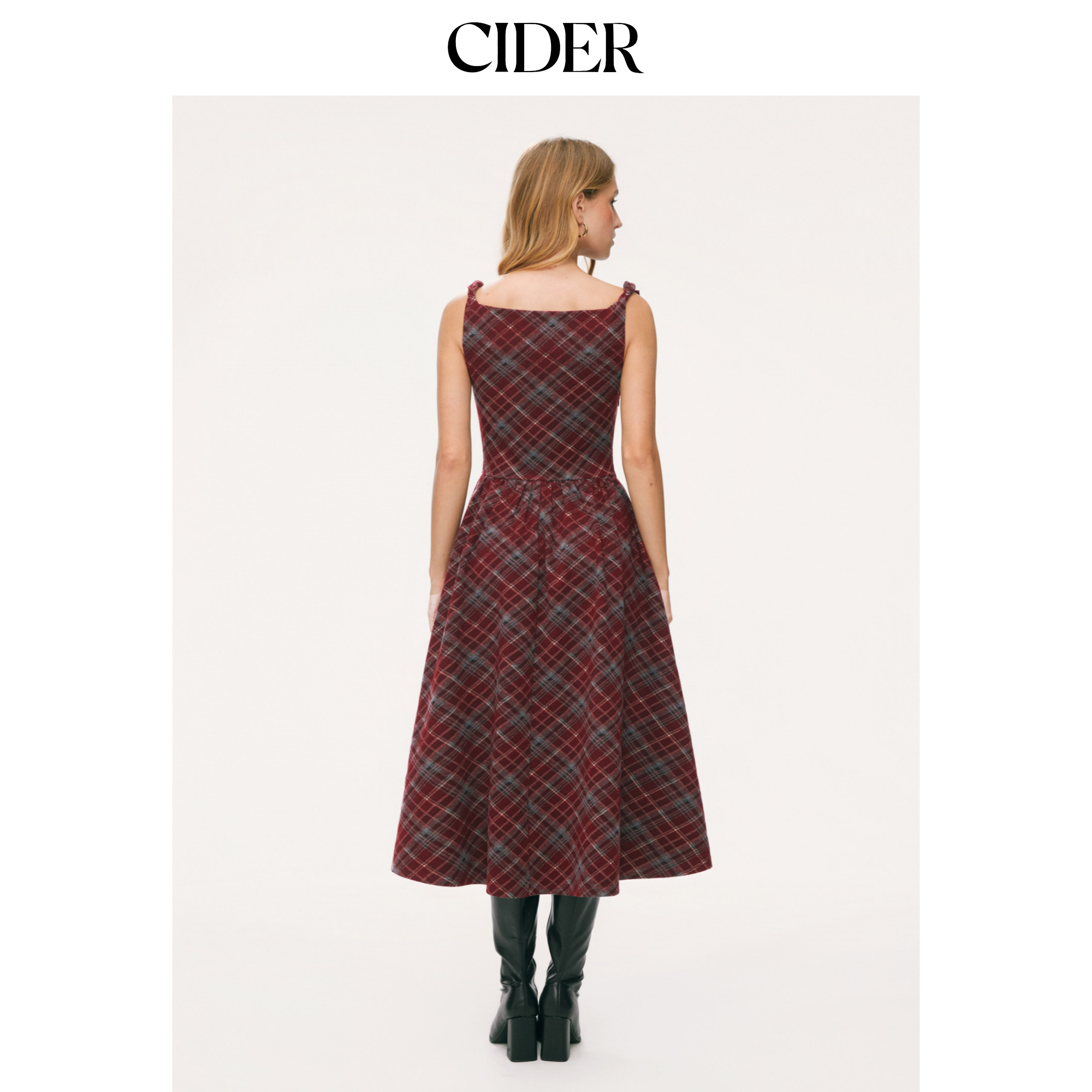 CIDER荡领格纹扭结A字中长吊带裙115050614