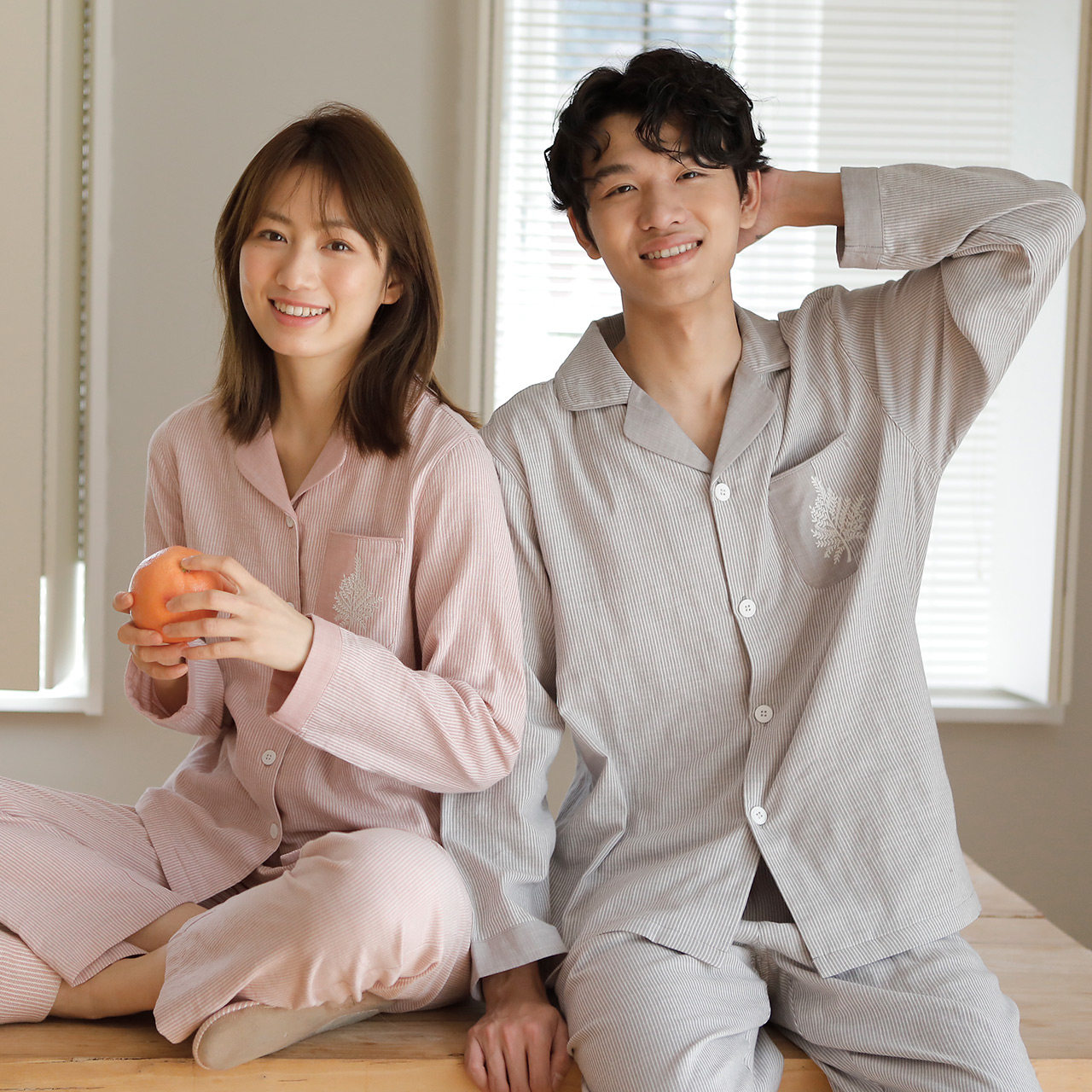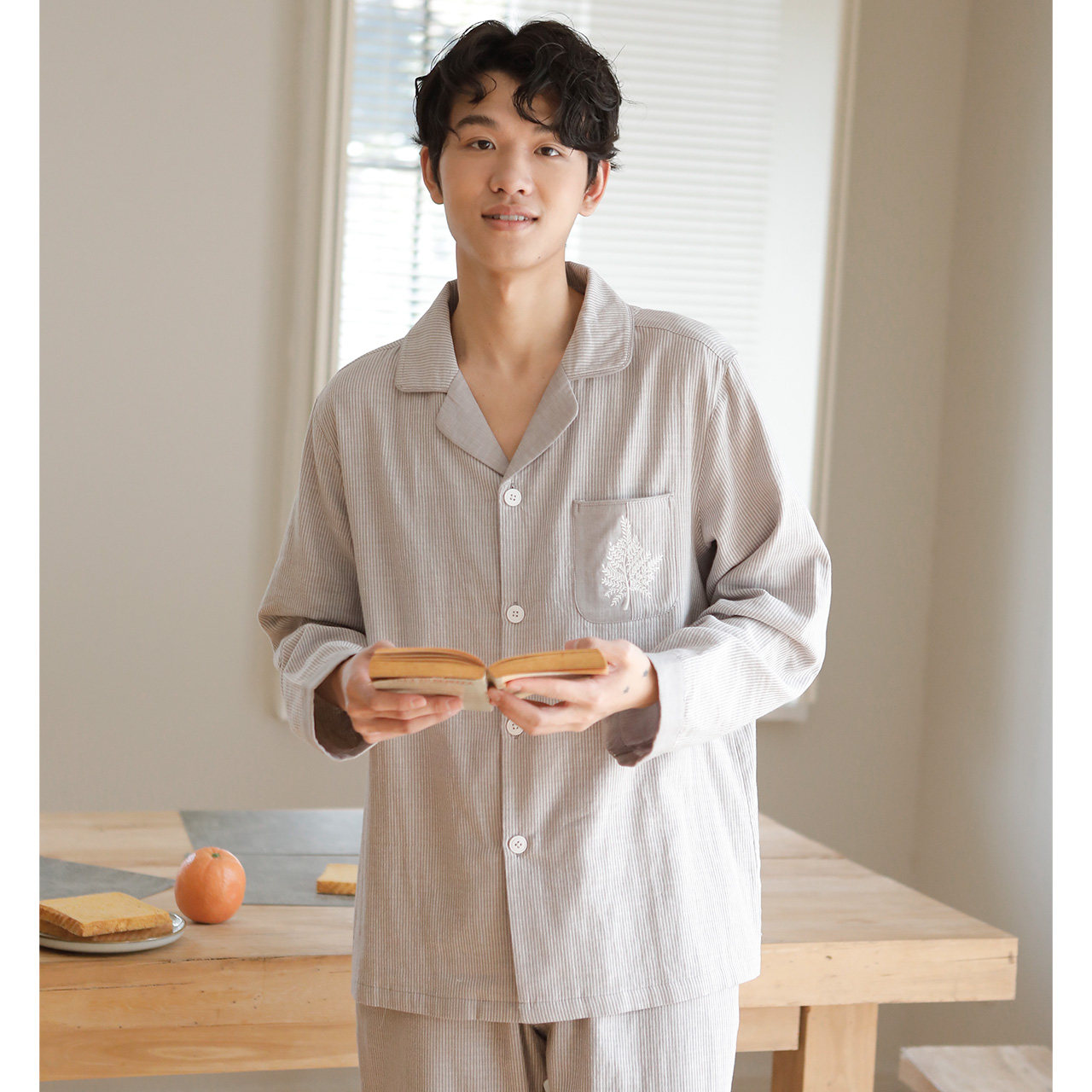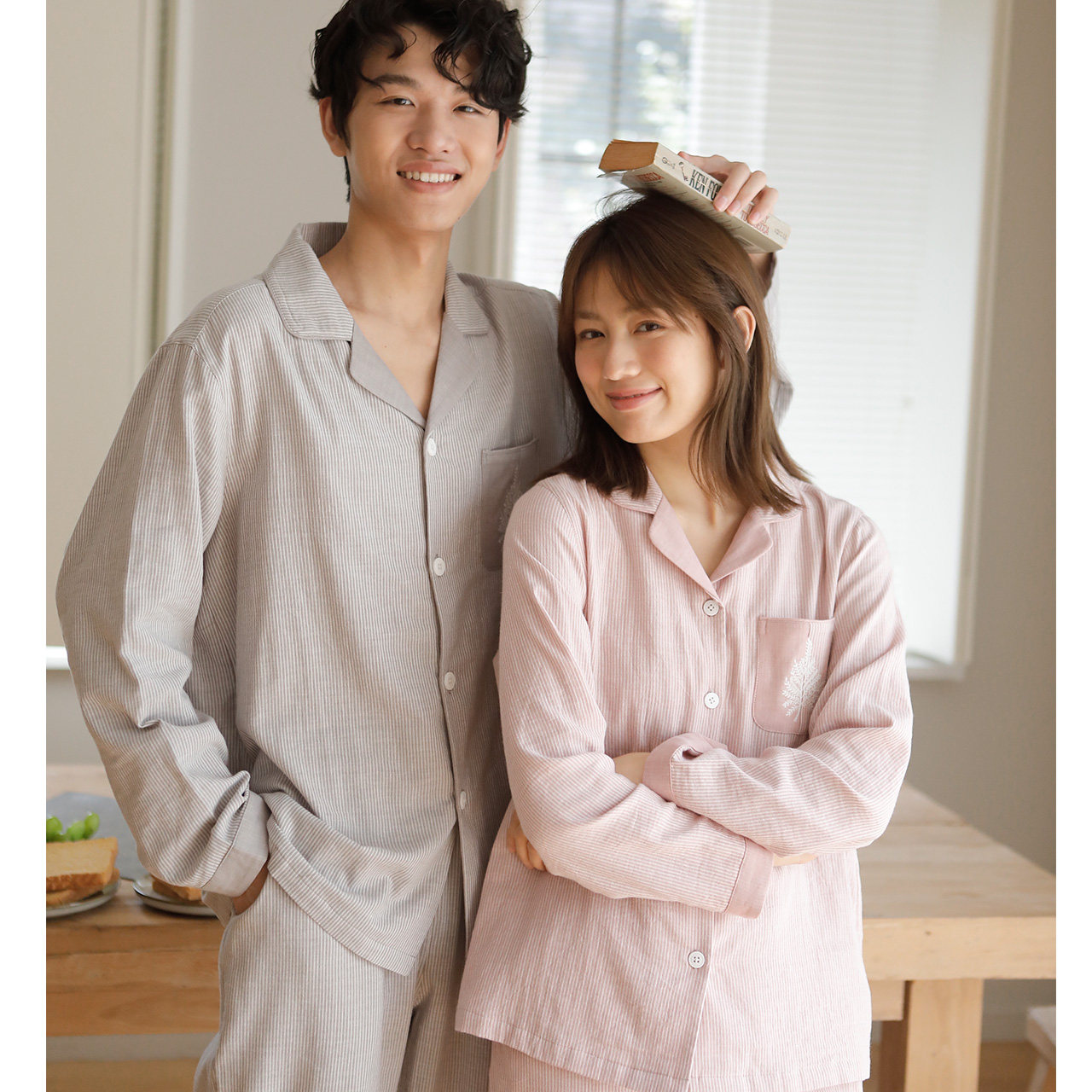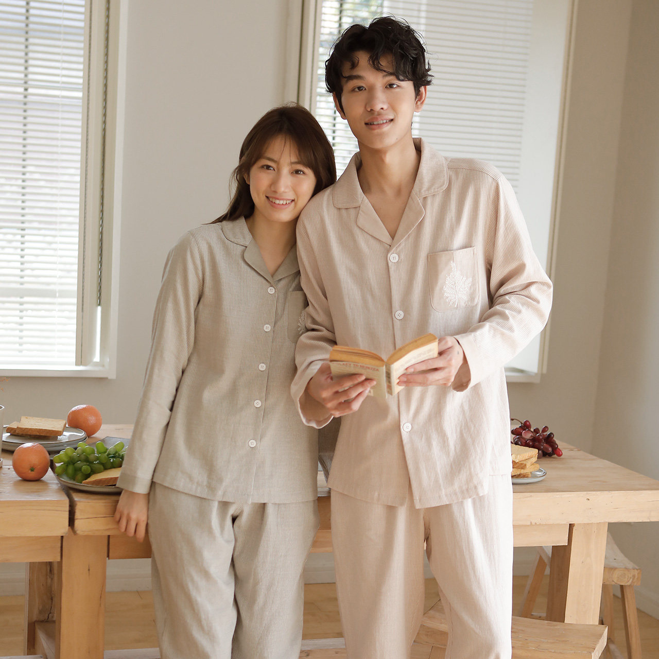 卡拉美拉简约风情侣睡衣男女纯棉双层纱布长袖家居服套装可外穿