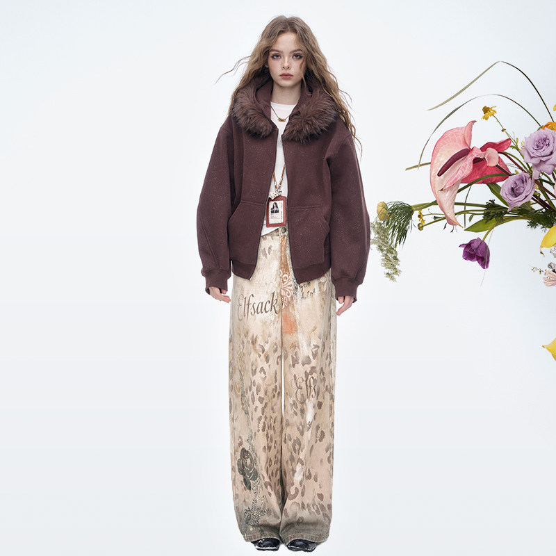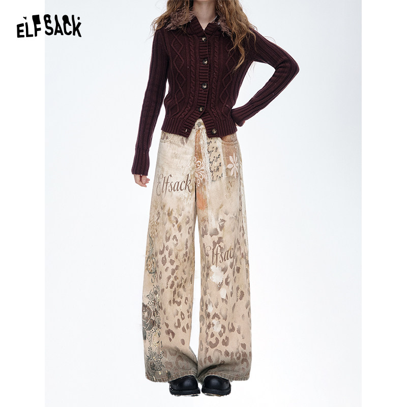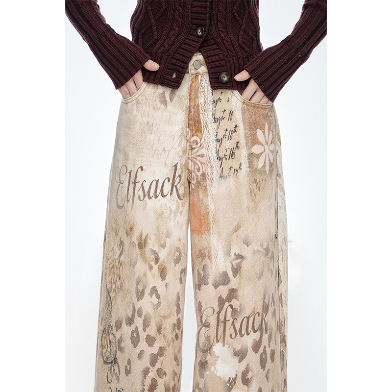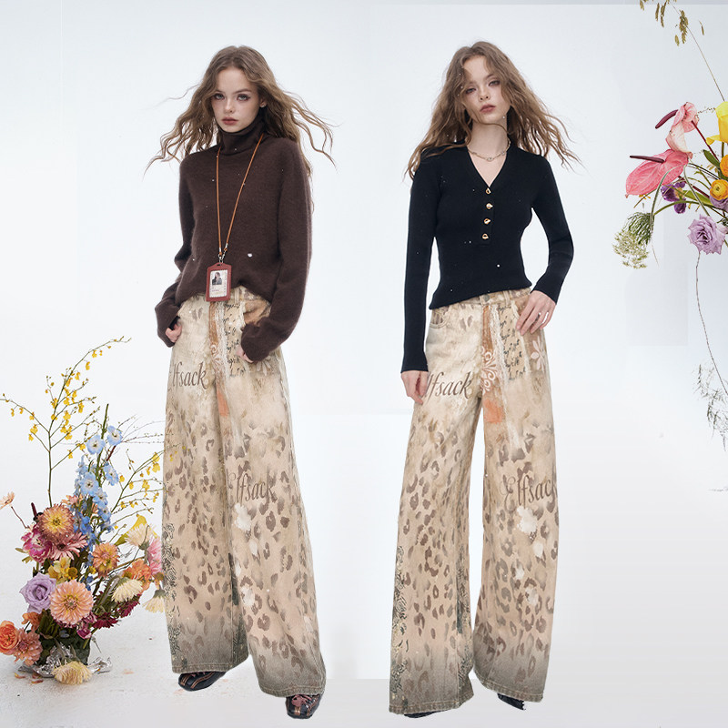 妖精的口袋原创豹纹印花牛仔裤女2026年早春新款复古显瘦阔腿裤子