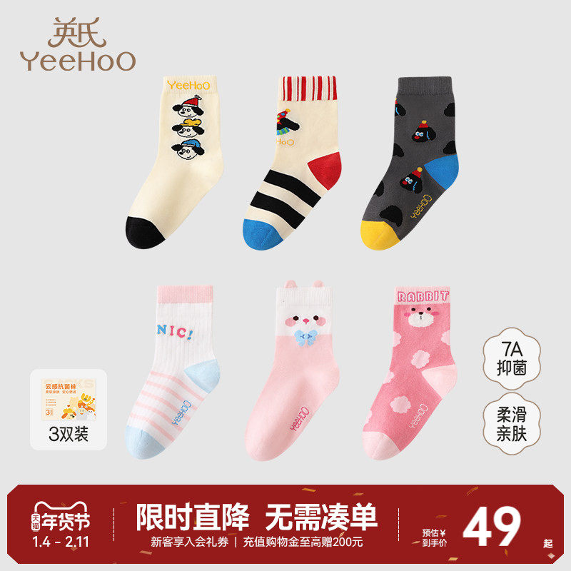 英氏儿童7A抑菌中筒秋冬款保暖男童女童地板袜撞色卡通可爱棉袜子