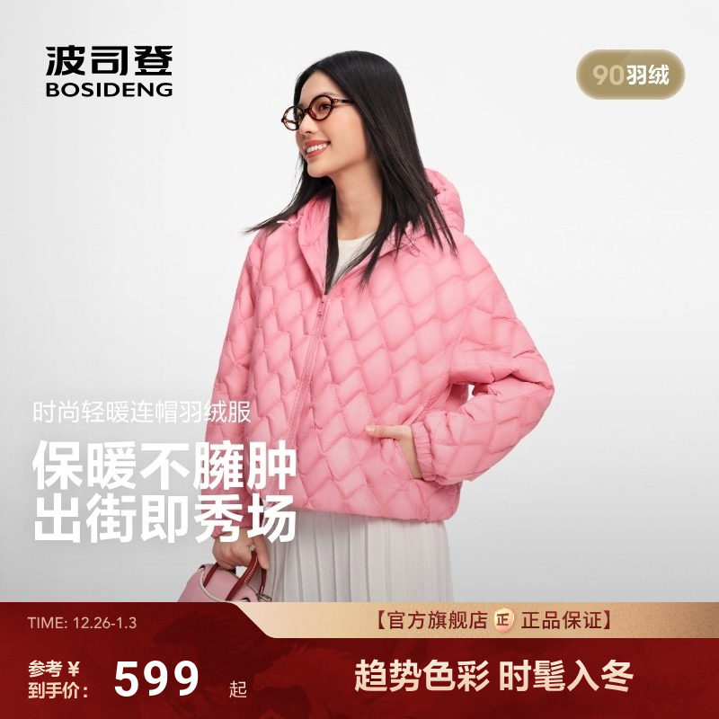 波司登2025新款女士宽松休闲菱形绗线连帽短款保暖轻薄羽绒服外套