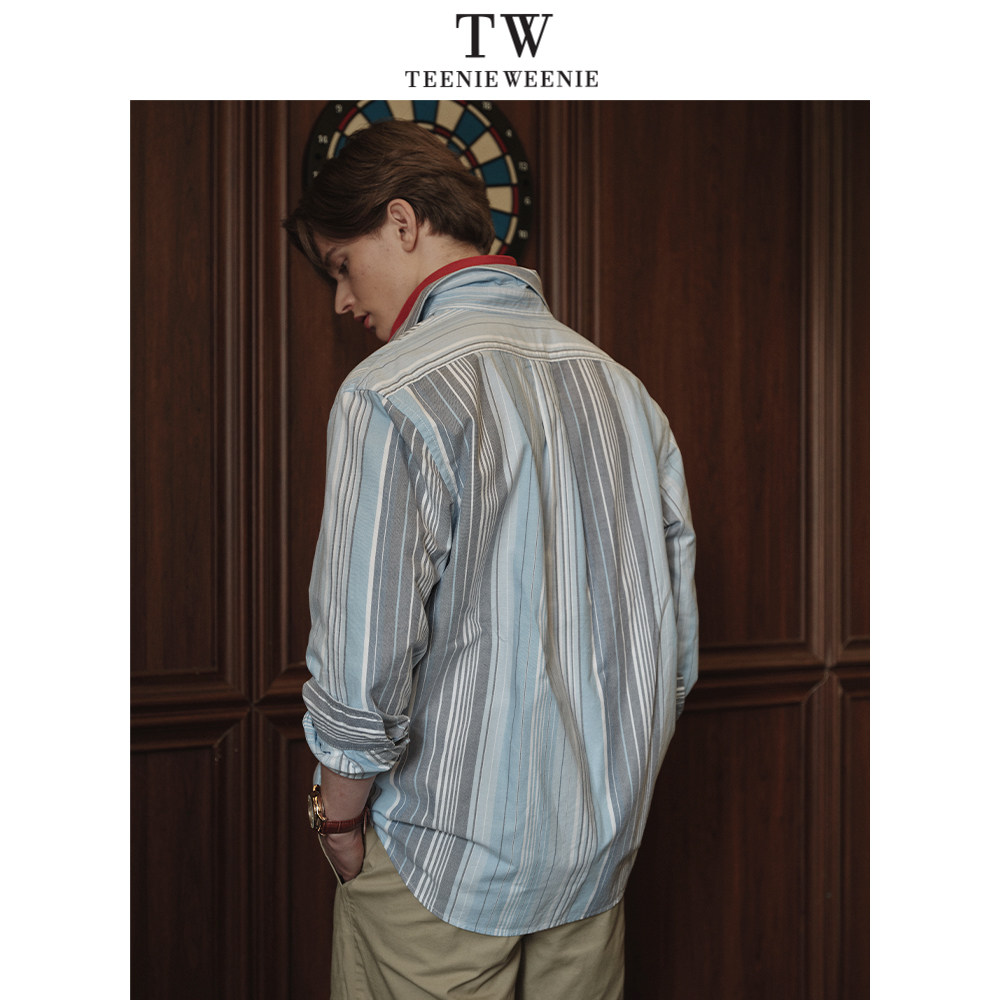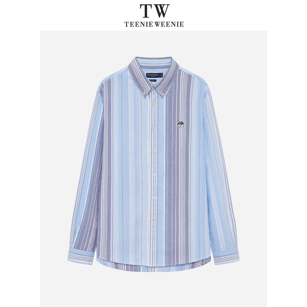 TeenieWeenie小熊男装长袖衬衫2025春季新款蓝灰条纹时尚简约衬衣