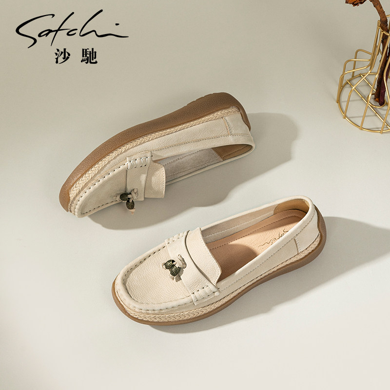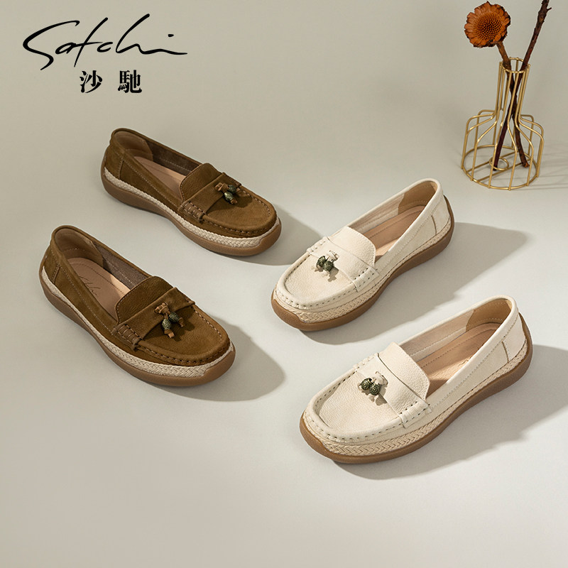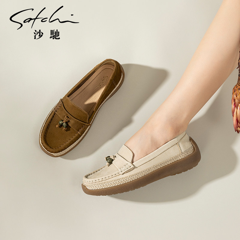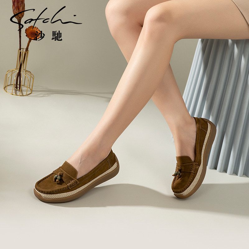 沙驰女鞋舒适软底平底豆豆鞋2025秋新款流苏吊坠休闲乐福鞋奶奶鞋