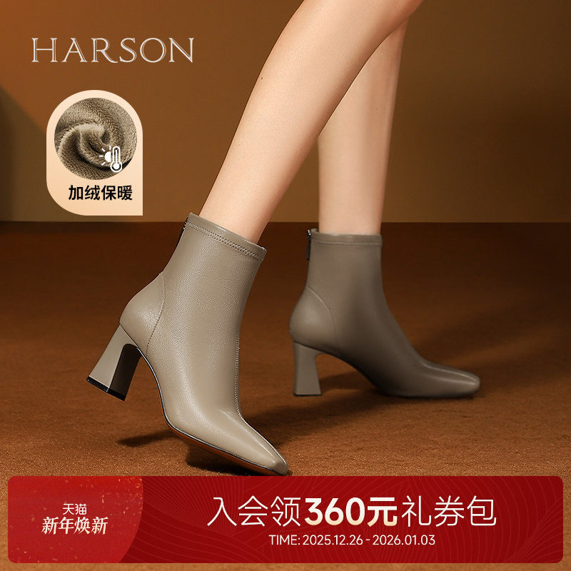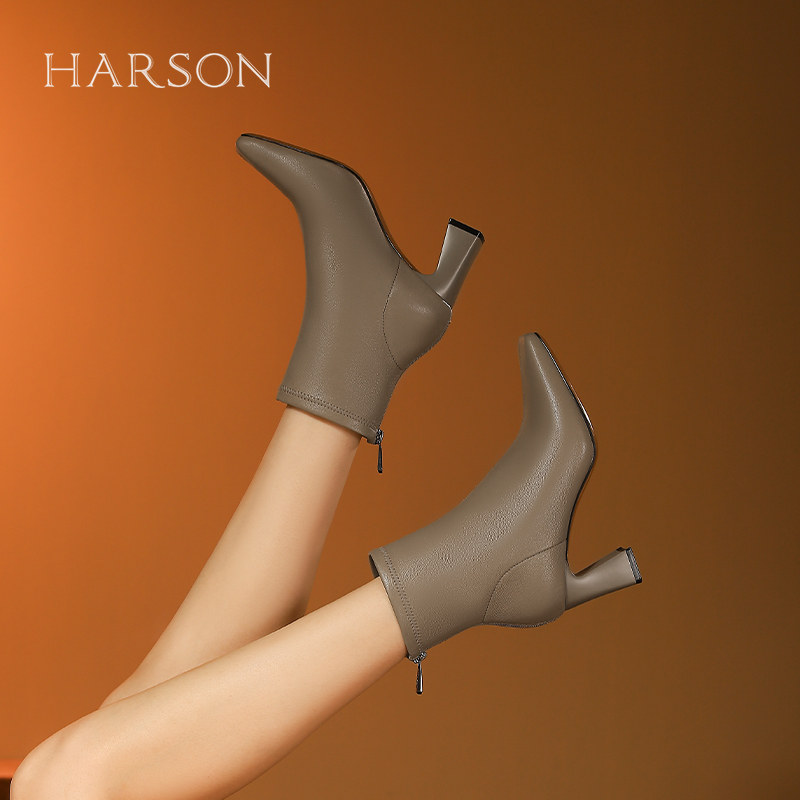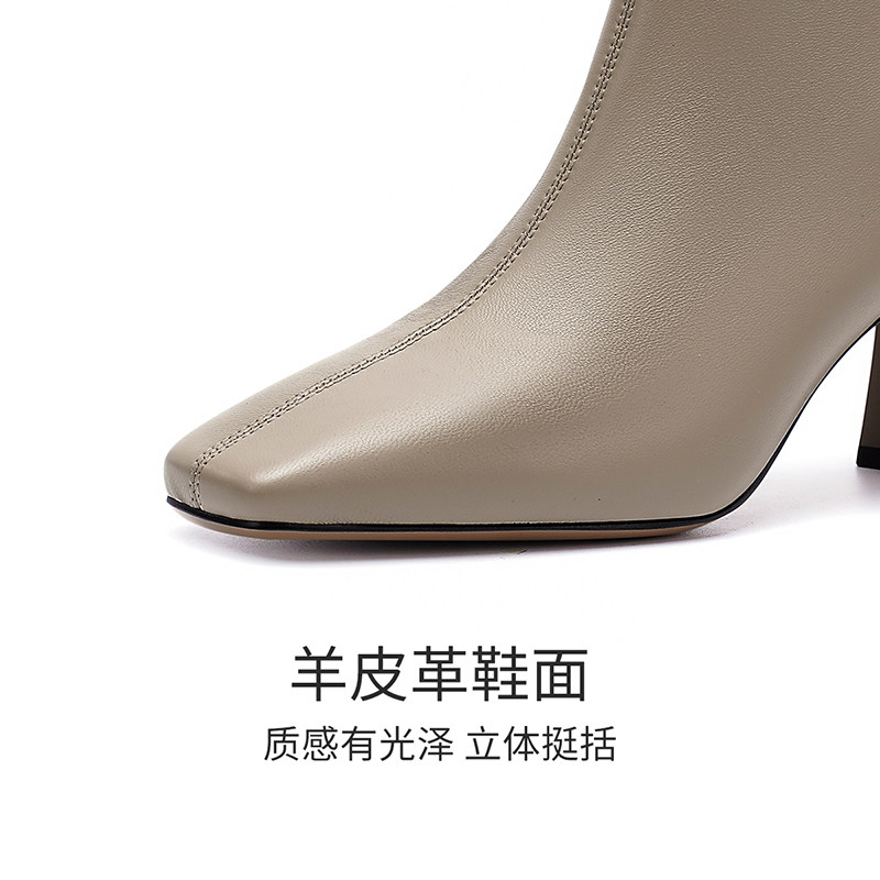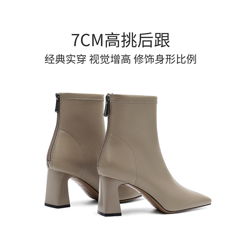 哈森法式粗高跟时装短靴女秋冬新款羊皮女靴瘦瘦靴HWA240132