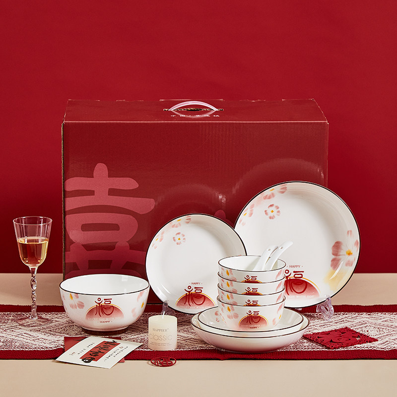 高档碗碟餐具陶瓷新婚礼物送新娘红色碗盘筷套装乔迁新居结婚礼盒