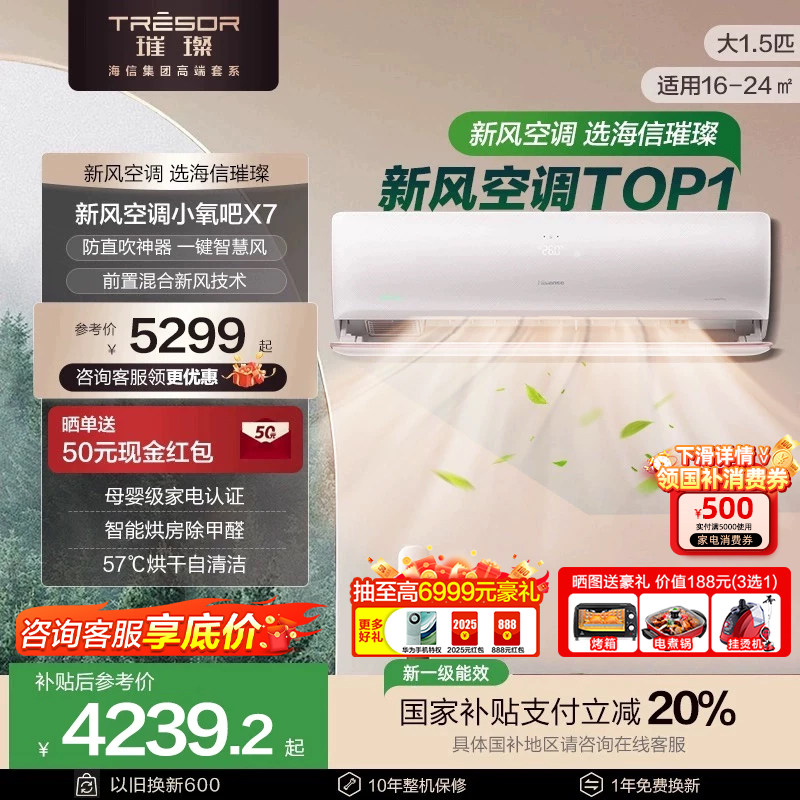 海信新风空调深睡宝X3Plus大1匹一级能效变频卧室家用挂机补贴