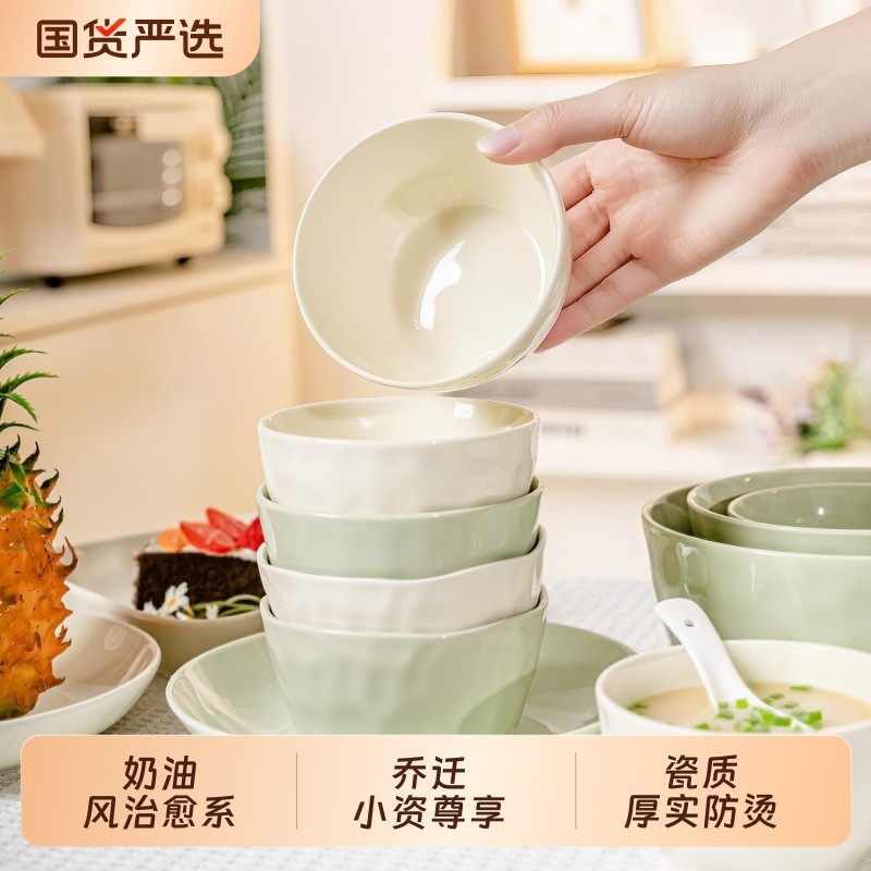 奶油风陶瓷碗家用卡通菜盘子可爱米饭碗汤碗釉下彩儿童餐具耐高温
