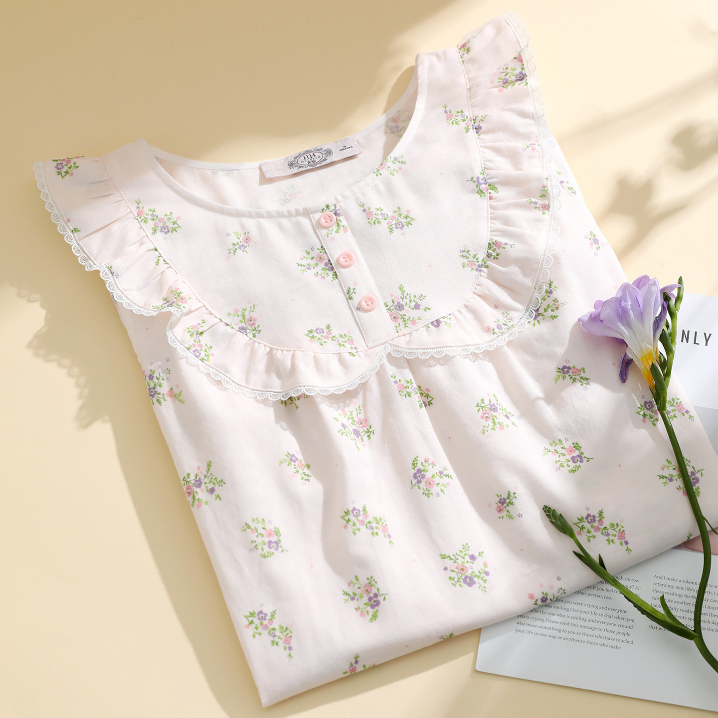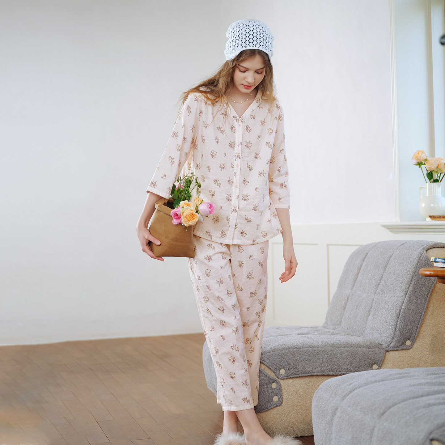 美标春夏新款七分袖纯棉睡衣套装女双层棉纱全棉可外穿蕾丝家居服