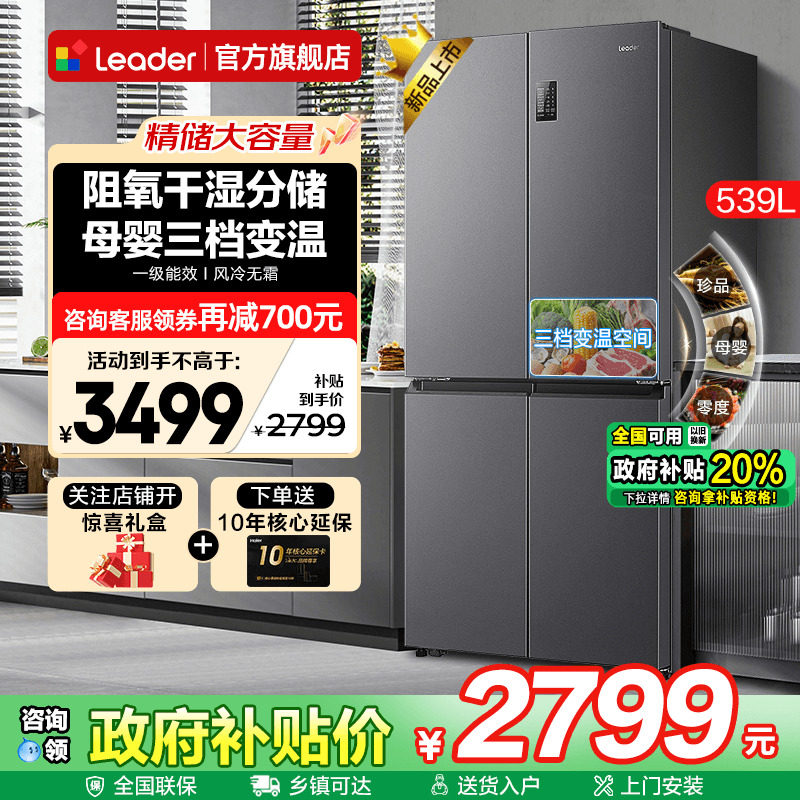 海尔冰箱Leader539升大容量家用十字四开门一级能效无霜官方旗舰