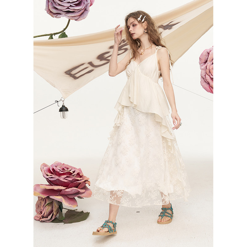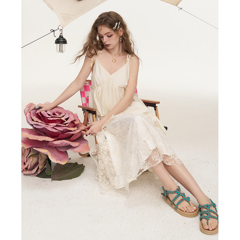 妖精的口袋白色蕾丝拼接不规则吊带连衣裙女2025夏新款气质仙女裙