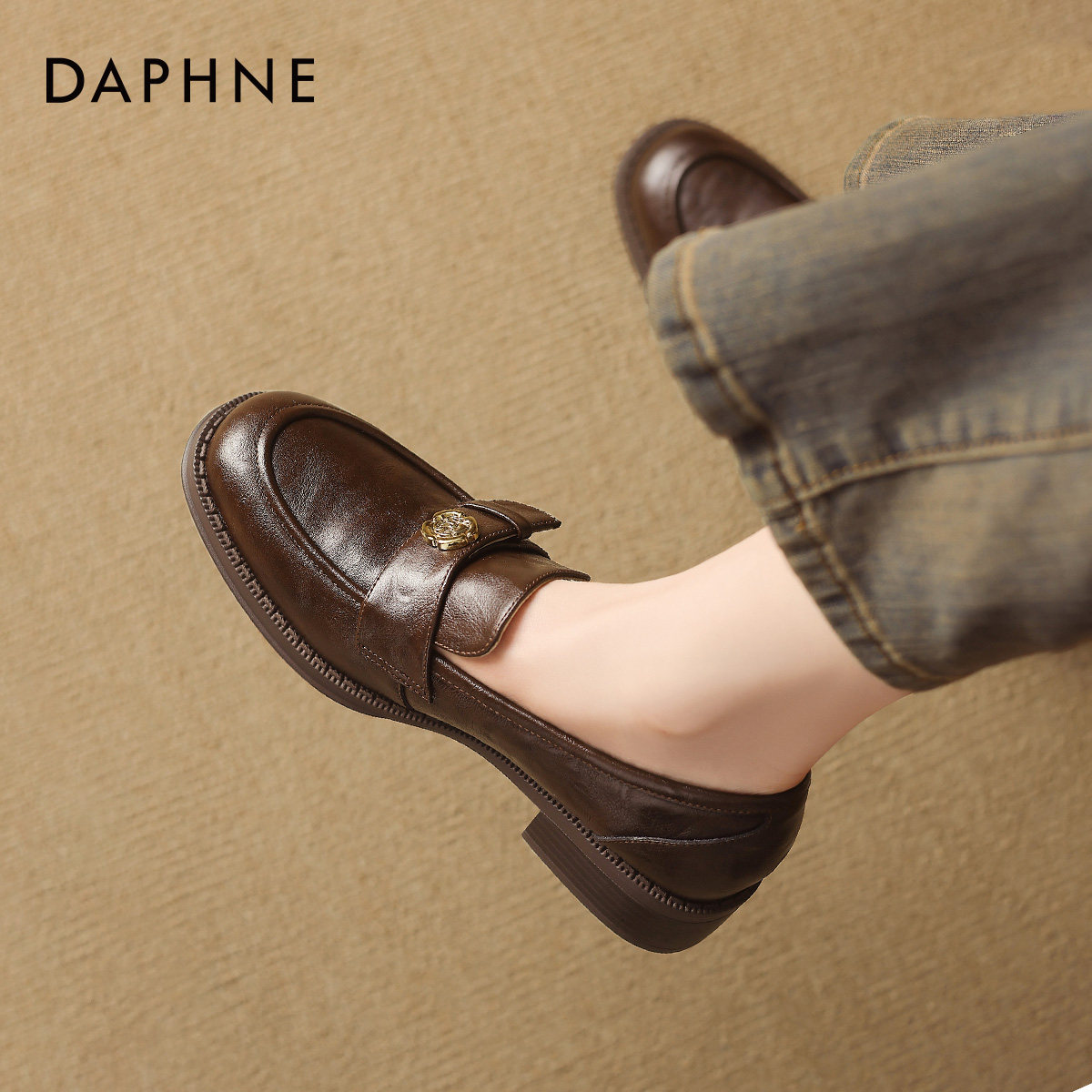 小桃同款真美诗自由之歌秋季新款水洗牛皮棕色复古小皮鞋乐福鞋女