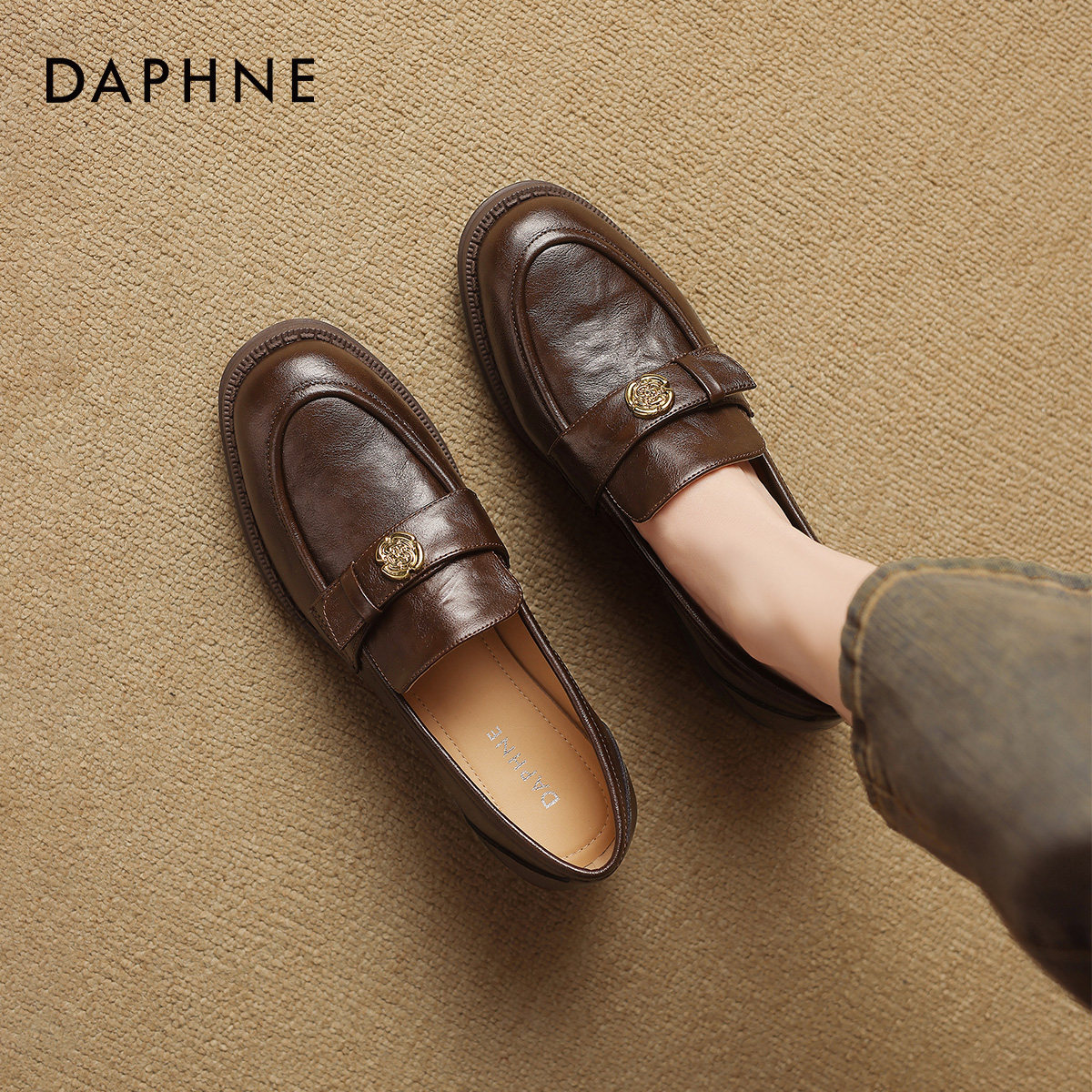 羊皮~棕色山茶花乐福鞋女2025新款通勤粗跟单鞋百搭英伦风小皮鞋
