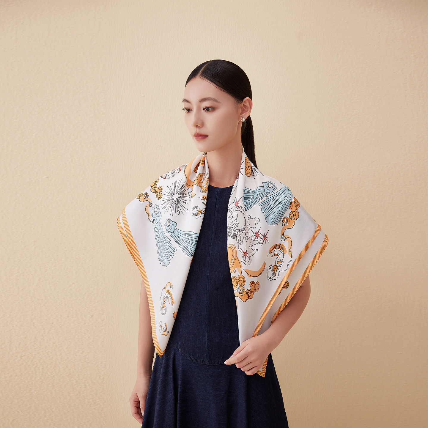 万事利100%桑蚕丝卷边丝巾披肩女手绘涂鸦大方巾生日礼物星光灿烂