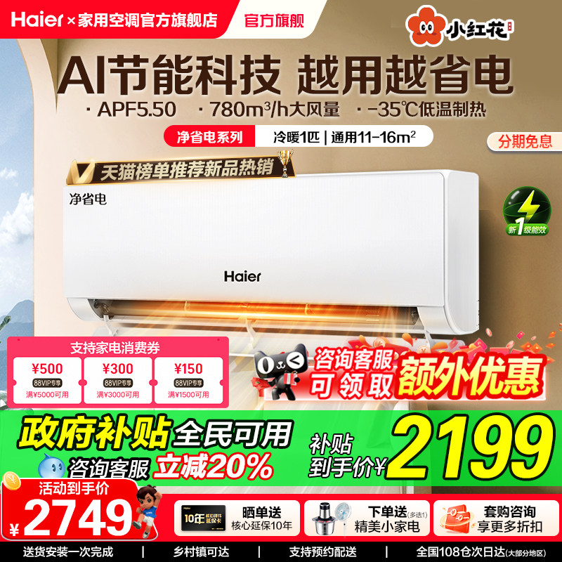 国补20%海尔净省电小红花空调1.5匹一级能效变频冷暖家用省电挂机