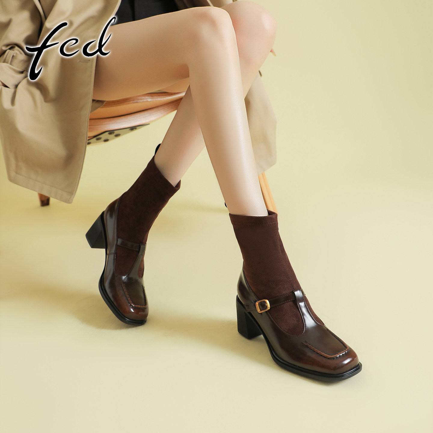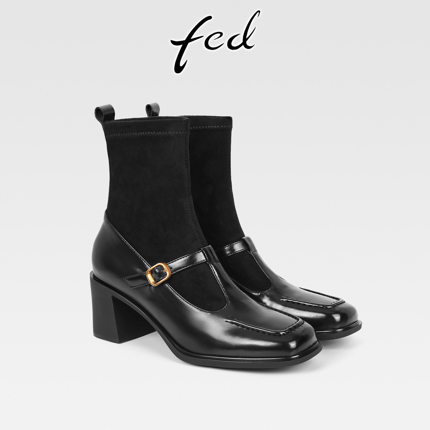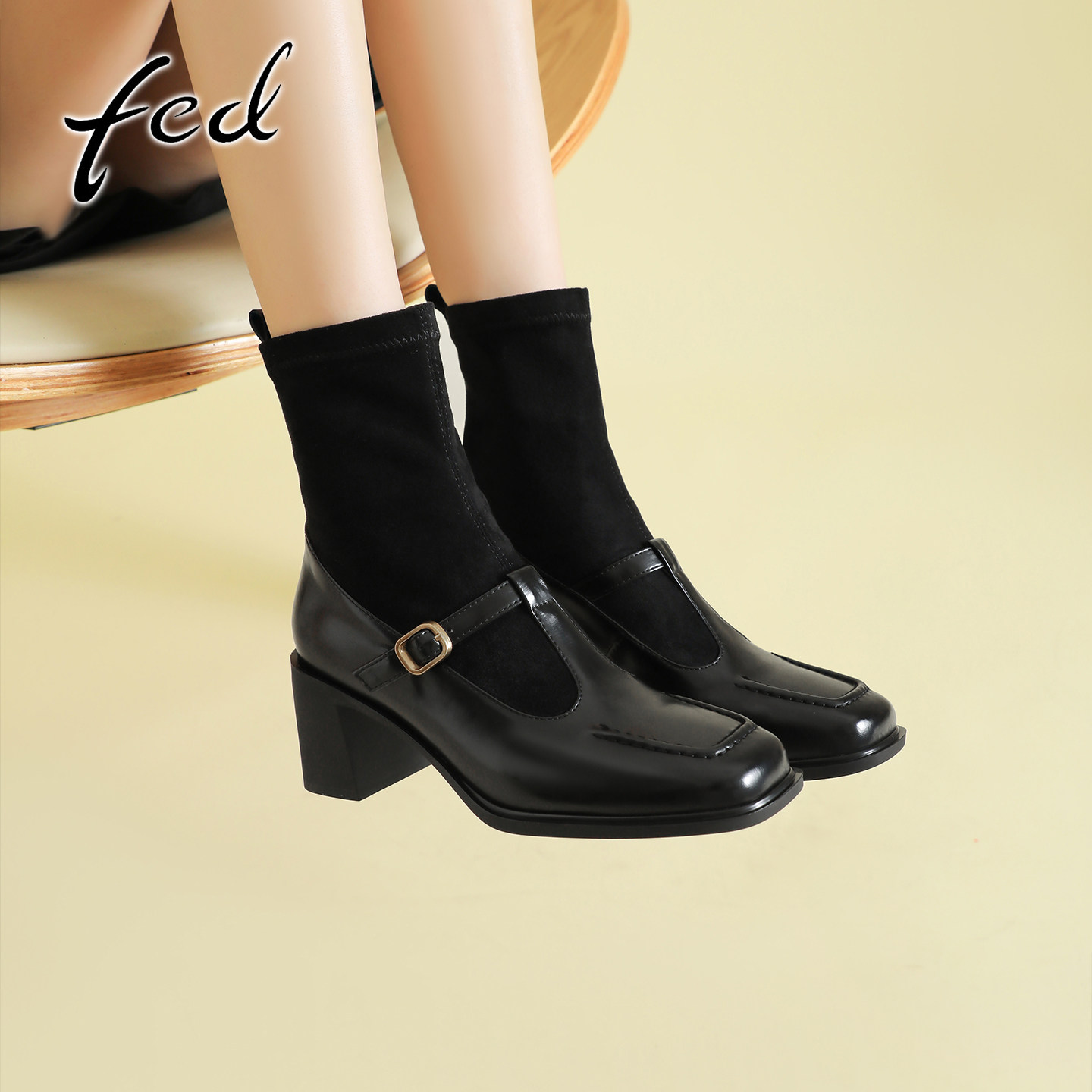 fed法式真皮粗跟拼接绒面弹力瘦瘦靴女春秋单靴气质方头高跟短靴