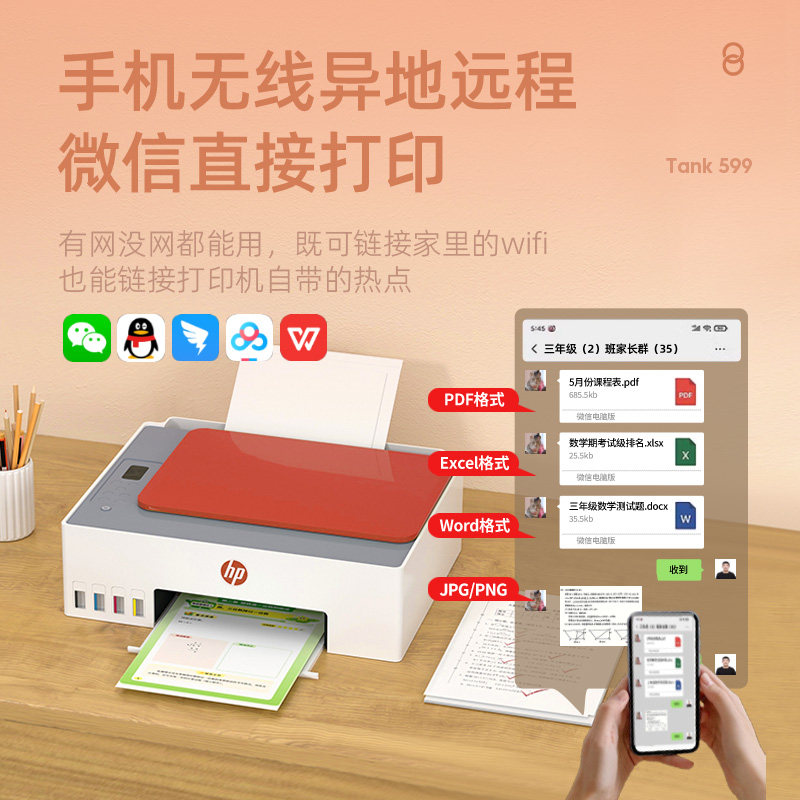 惠普Tank599家用小型打印机政府补贴彩色墨仓式复印扫描一体机多功能无线可连接手机照片A4学生作业连供592