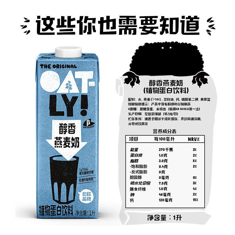 OATLY醇香燕麦奶1L*6整箱囤货植物蛋白饮料0乳糖高钙营养早餐奶