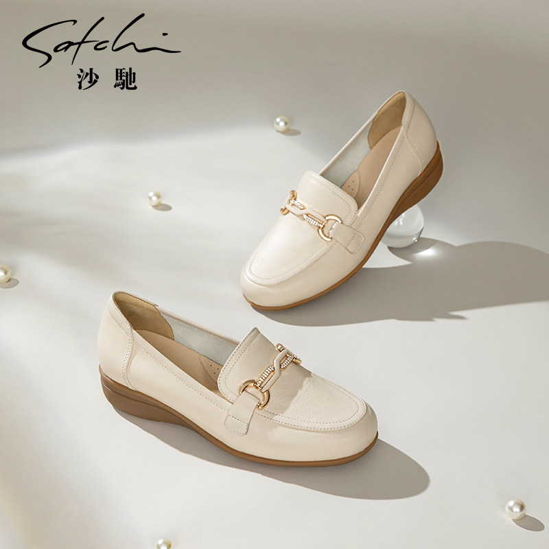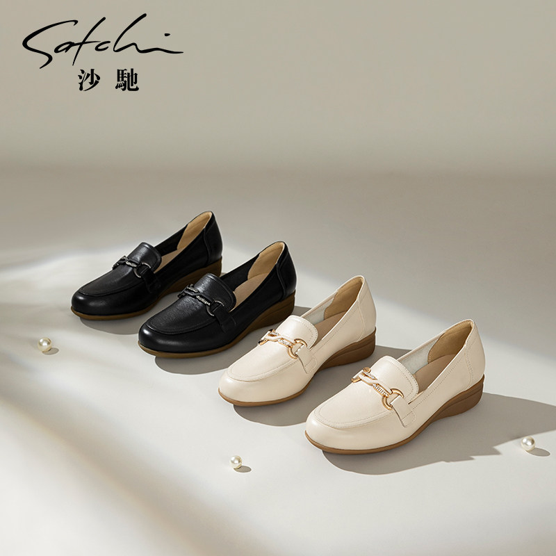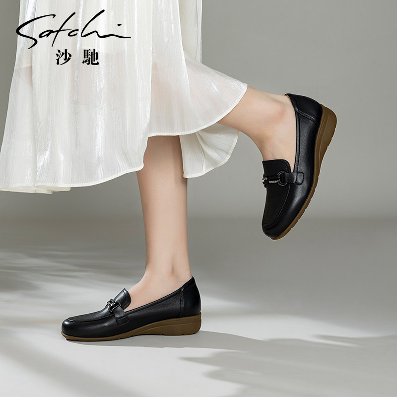 沙驰女鞋低跟坡跟乐福鞋26年春季新款一脚蹬懒人鞋单鞋牛皮深口鞋
