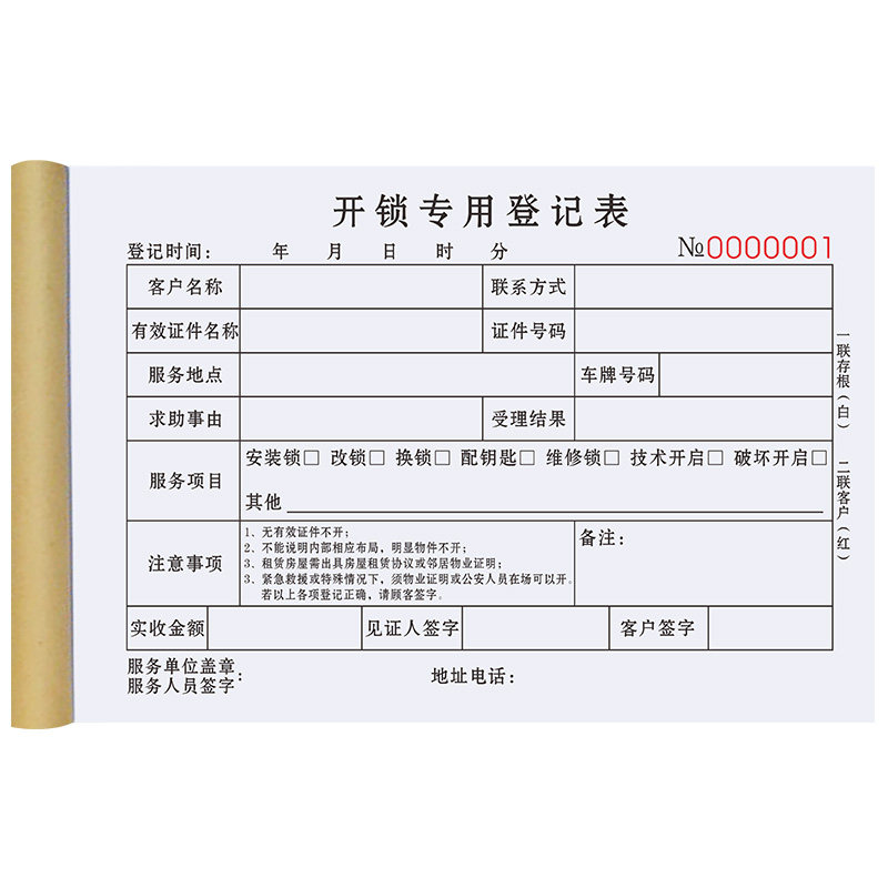 开锁登记本配汽车钥匙换锁记录表锁匠锁具指纹锁合同公司修锁收据