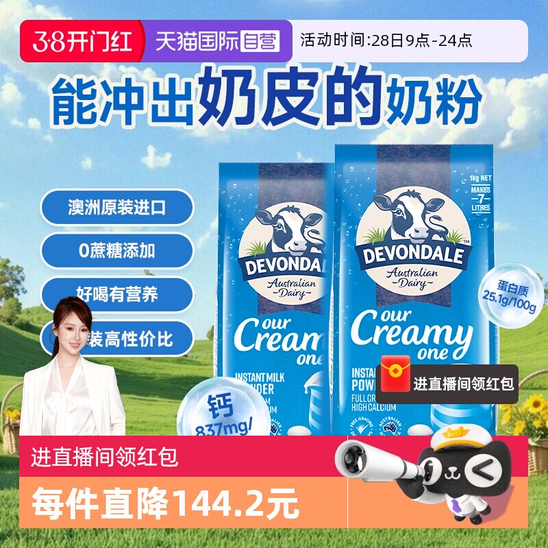 【自营】澳洲原装进口德运全脂高钙全家营养牛奶粉1kg*2袋
