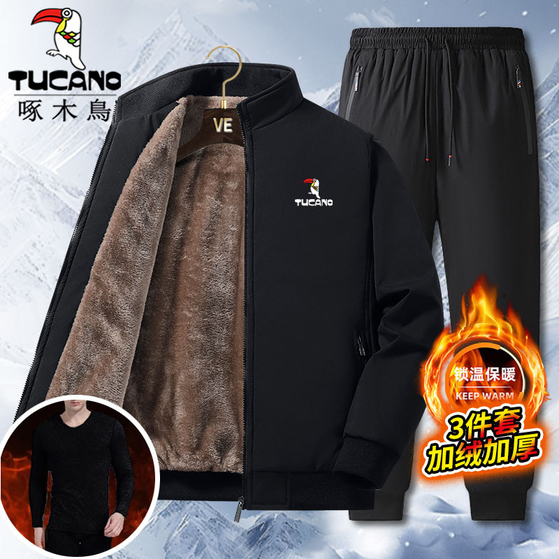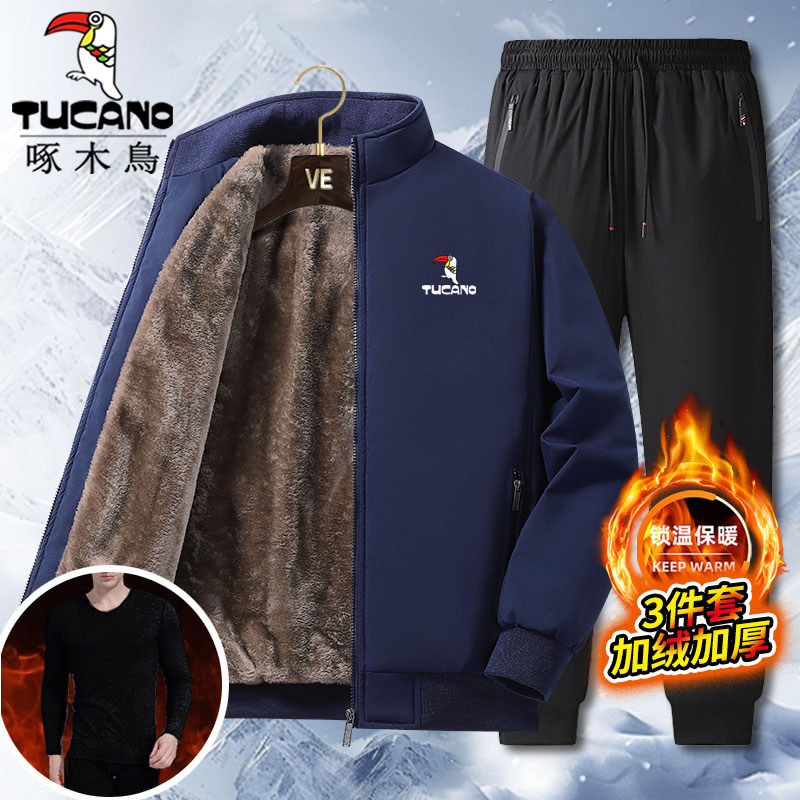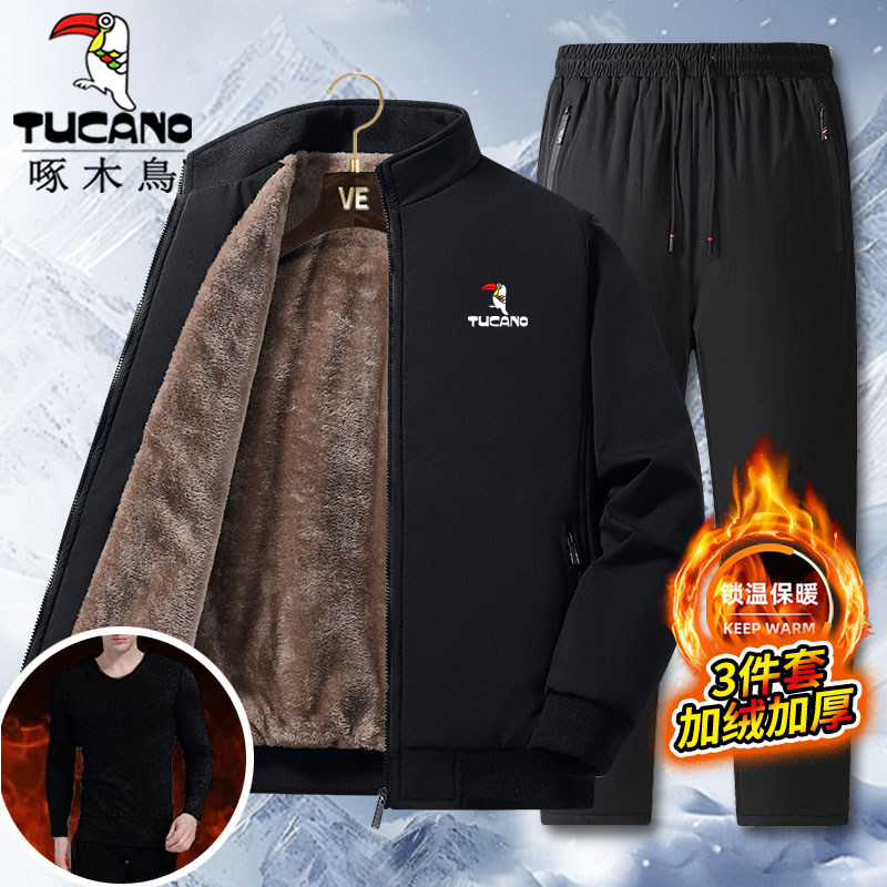 啄木鸟冬季爸爸休闲运动服开衫套装男加绒加厚立领宽松2/3件套