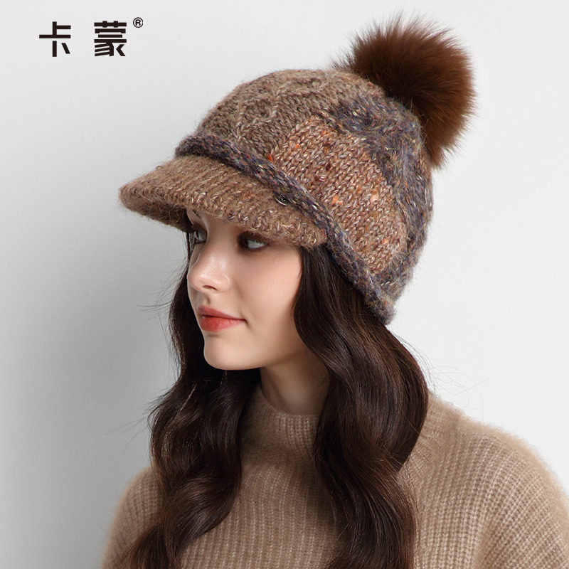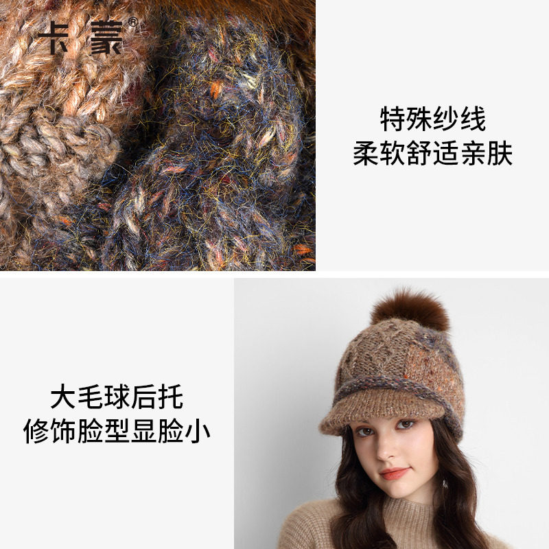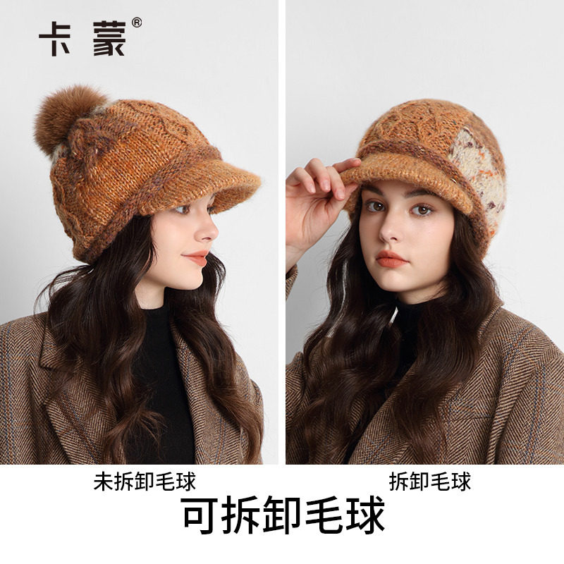 卡蒙手工编织羊毛毛线贝雷帽女大头围鸭舌堆堆帽可爱毛球针织帽新