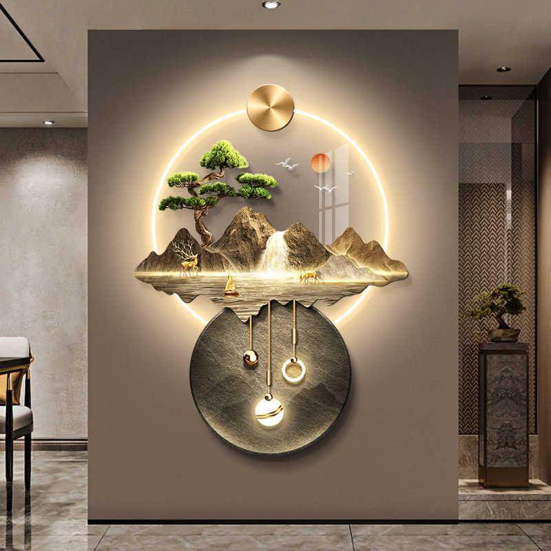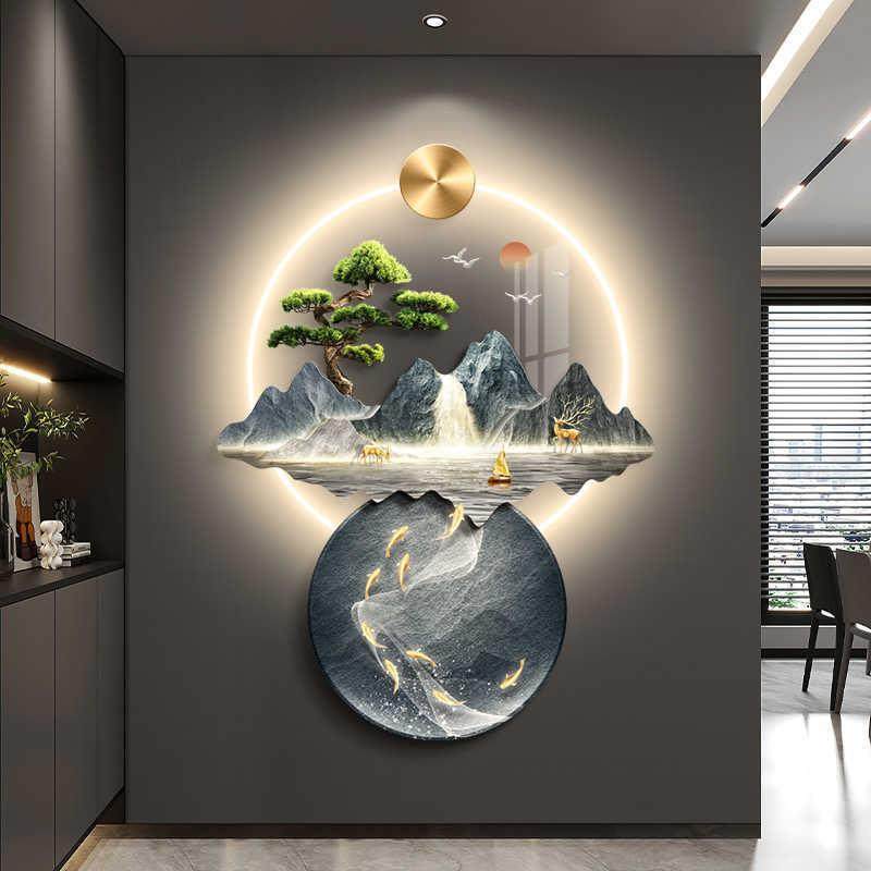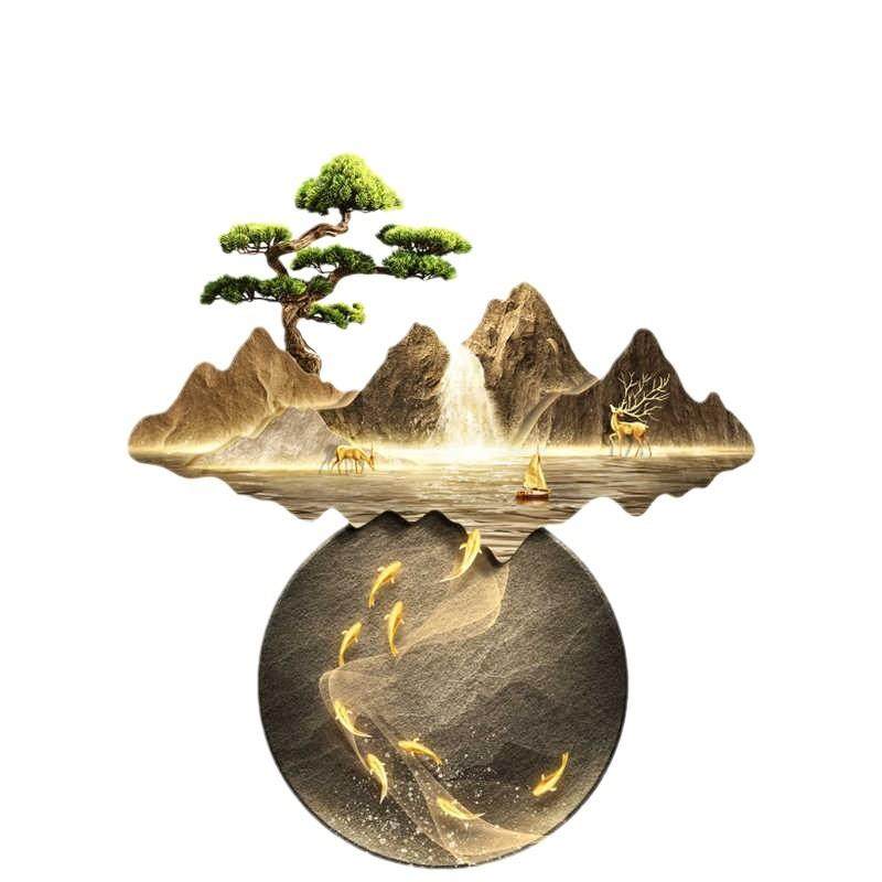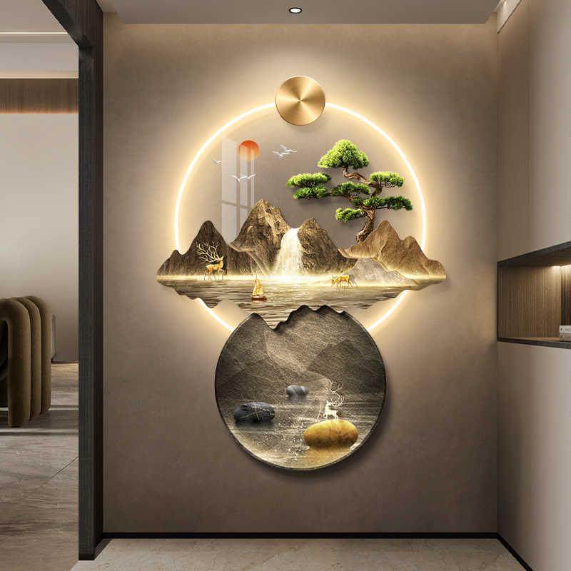 流水生财入户玄关装饰画新中式山水画过道立体挂画无框亚克力灯画