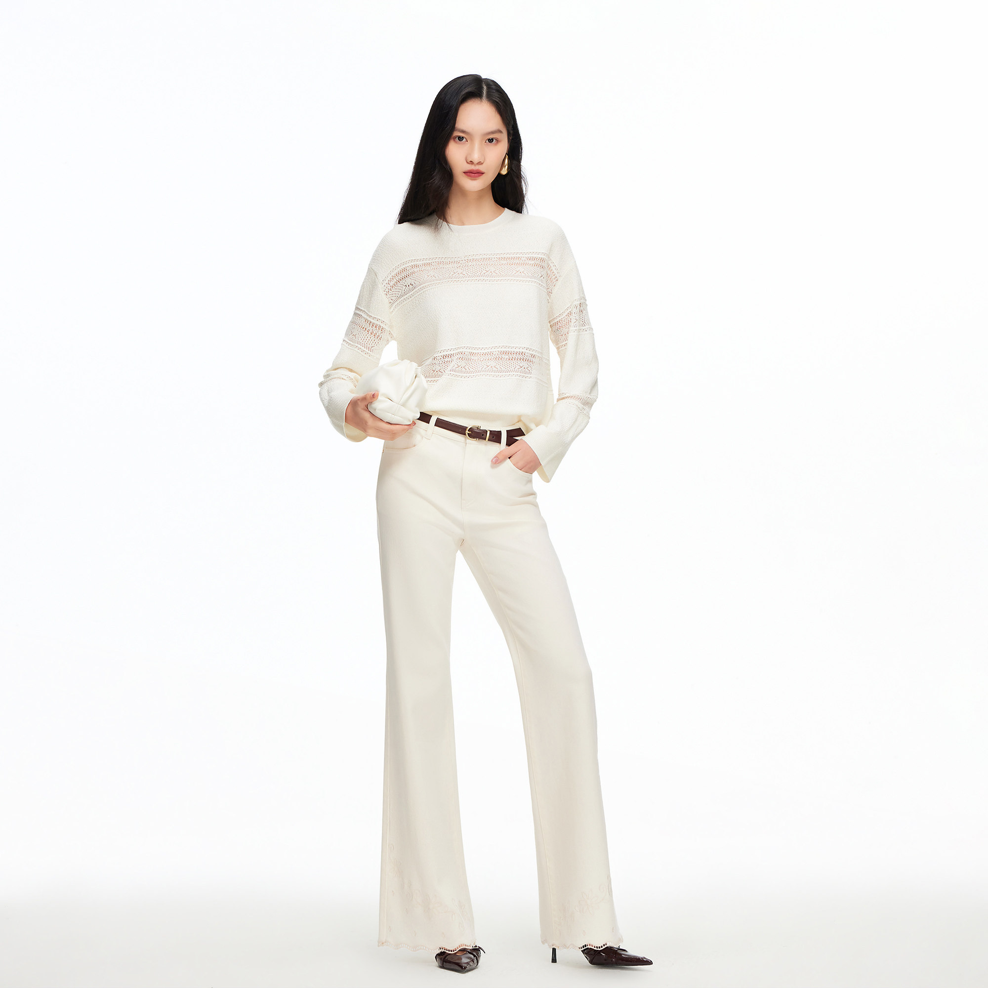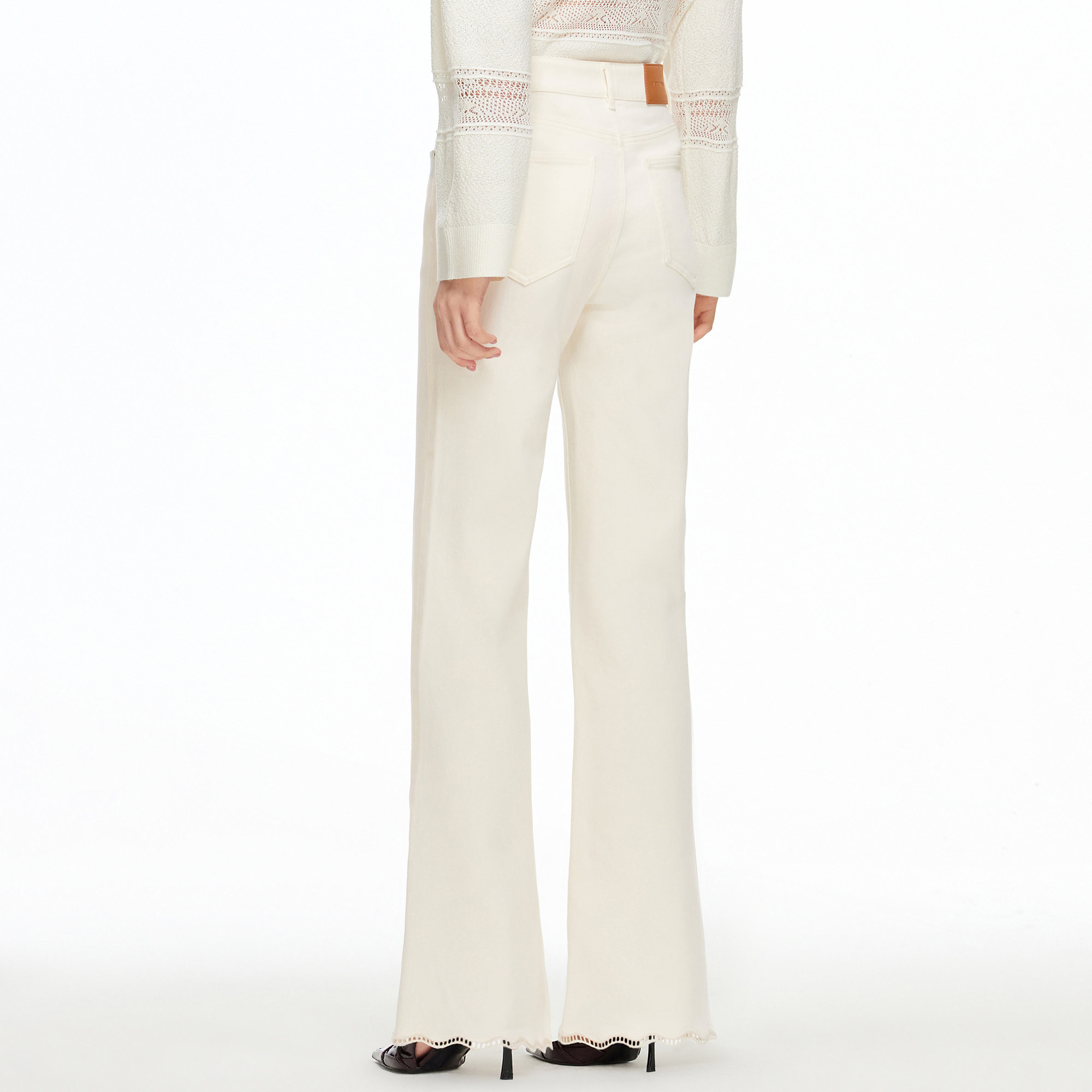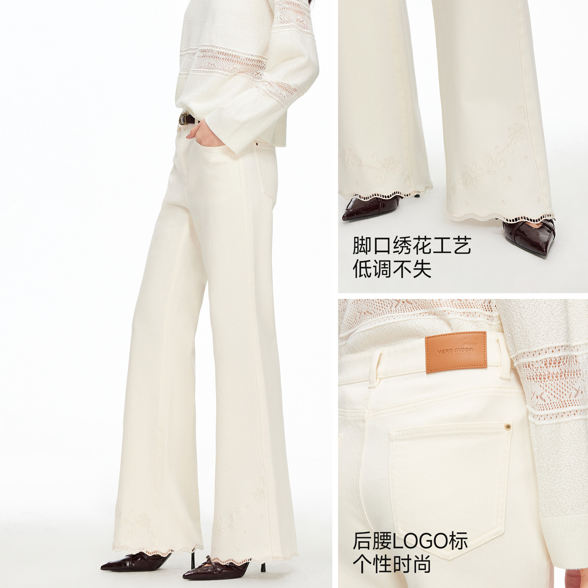脚口绣花工艺,低调不失细节;宽松喇叭裤