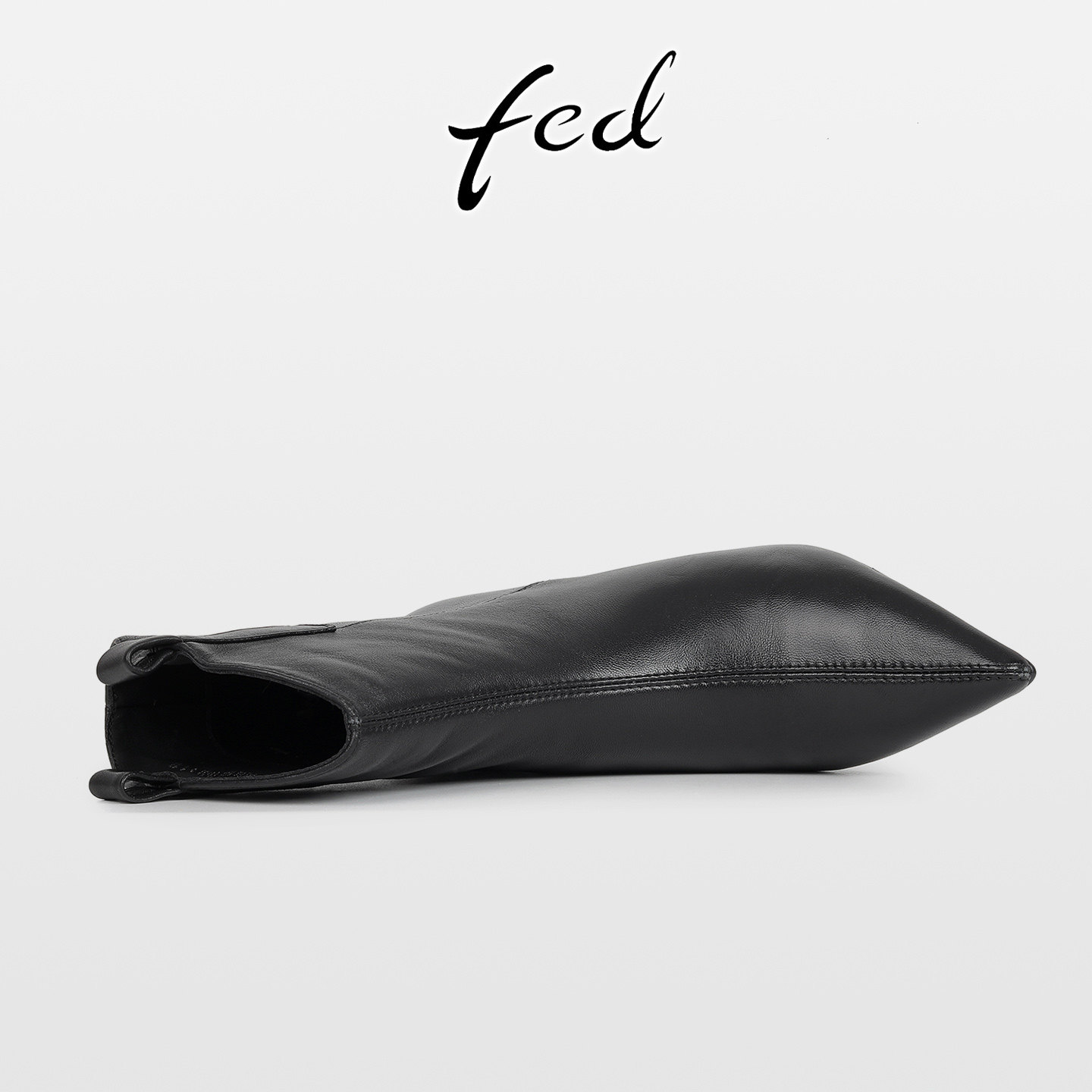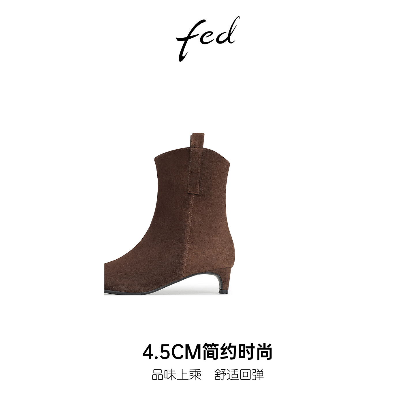 fed法式复古真皮细跟瘦瘦西部靴女秋冬新款气质尖头中跟通勤短靴