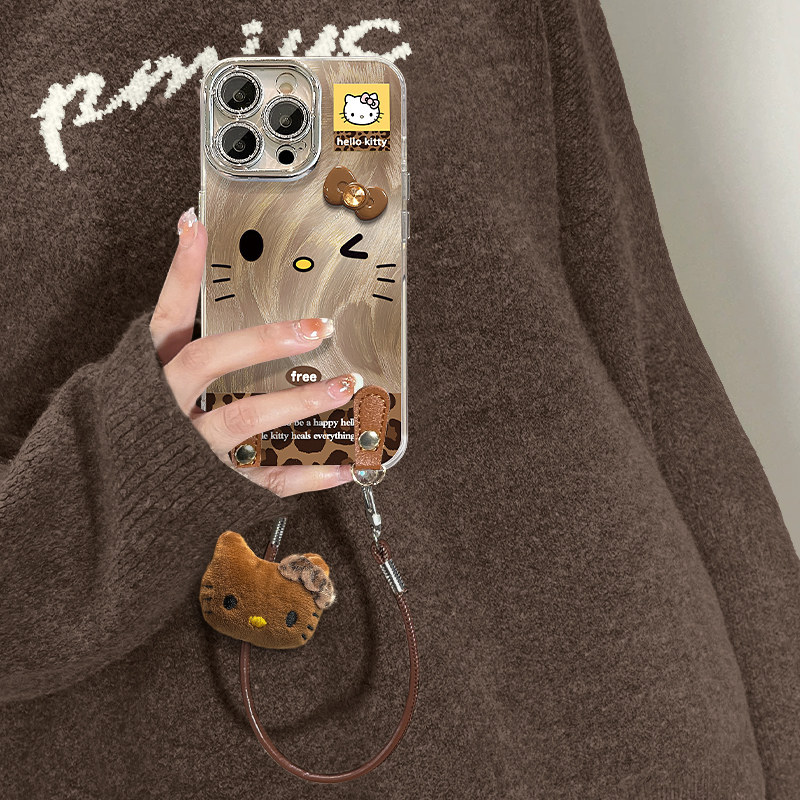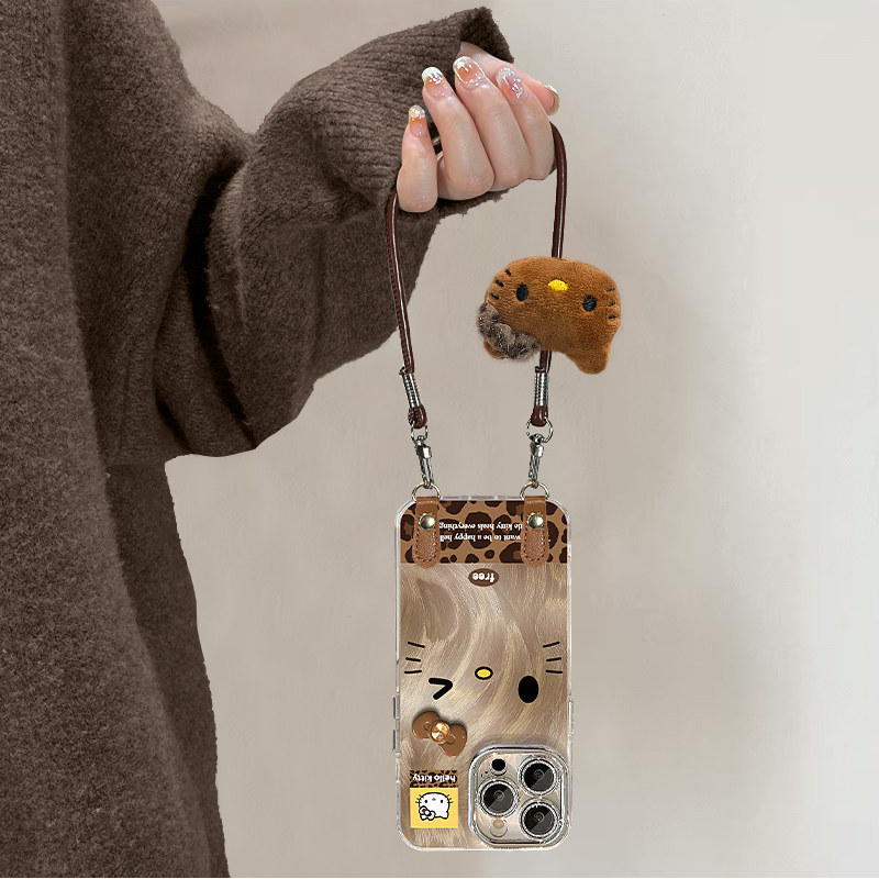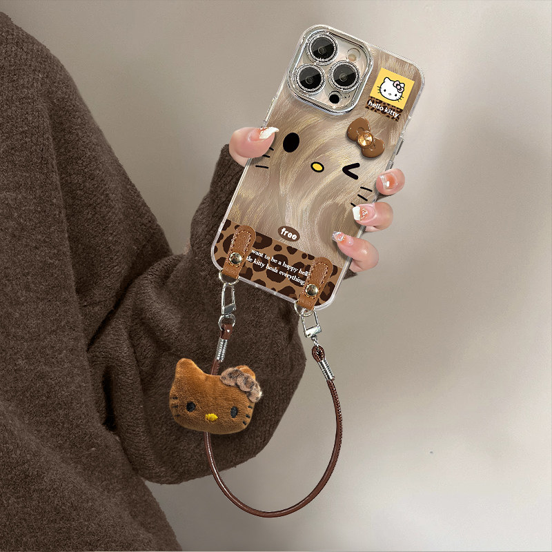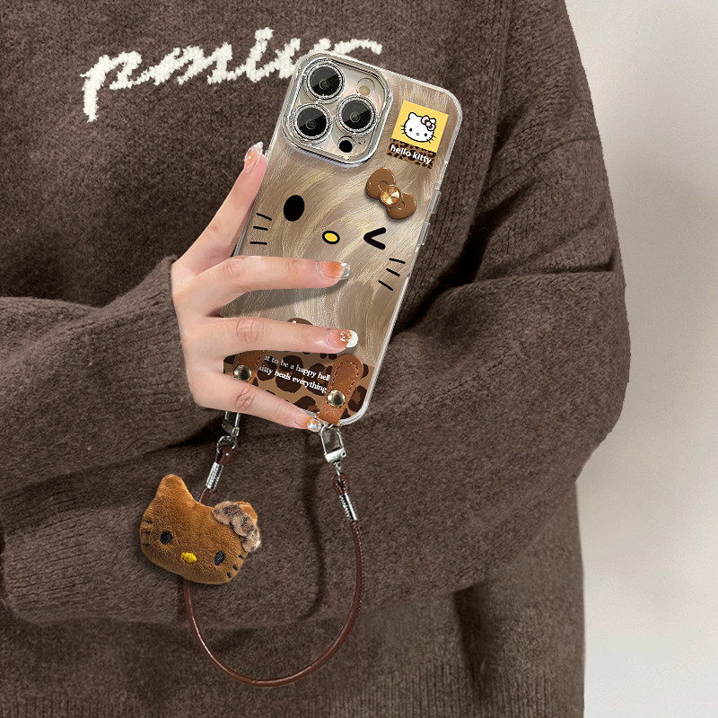 适用苹果17promax手机壳新女款16pro羽纱iPhone14咖色kt猫蝴蝶结挂绳13超火15plus全包镜头膜12美拉德11防摔