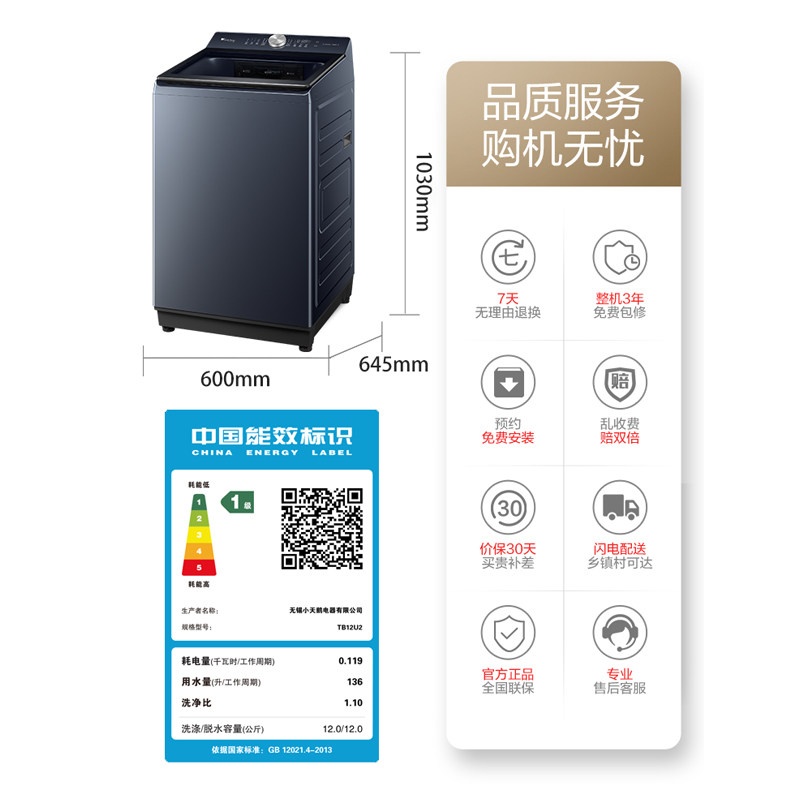 小天鹅水魔方家用全自动波轮12KG大容量变频洗脱一体洗衣机TB12U2