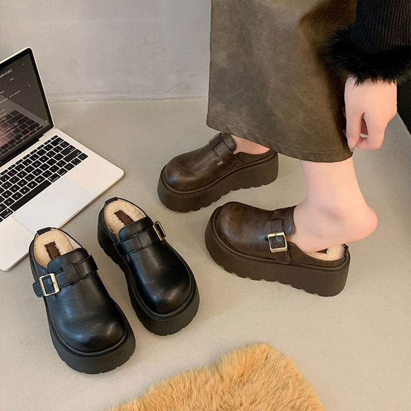 厚底增高包头半拖鞋女外穿勃肯鞋2025秋冬新款加绒懒人一脚蹬半拖