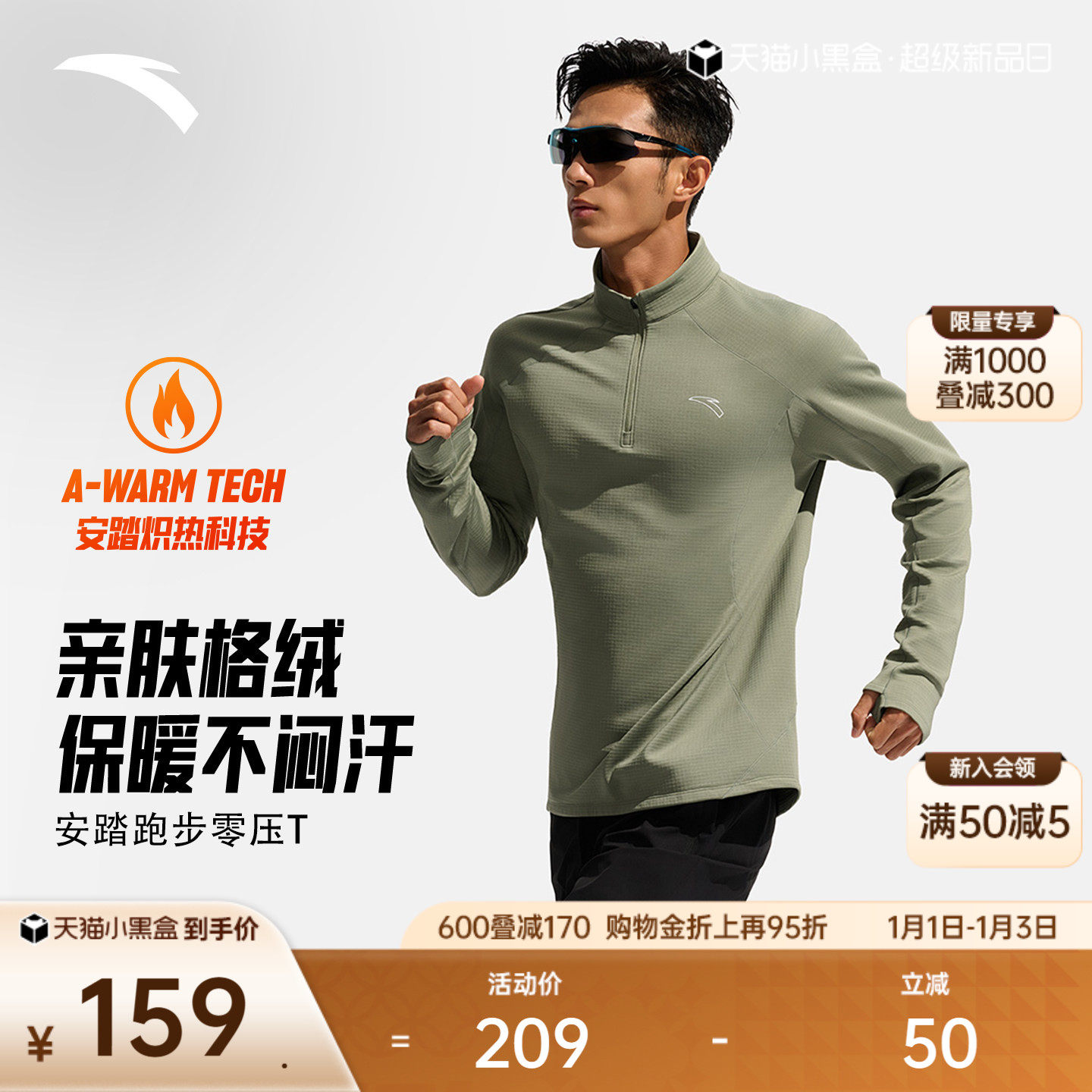 安踏跑步轻暖T丨加绒立领跑步服运动长袖t恤男士冬季新款针织上衣