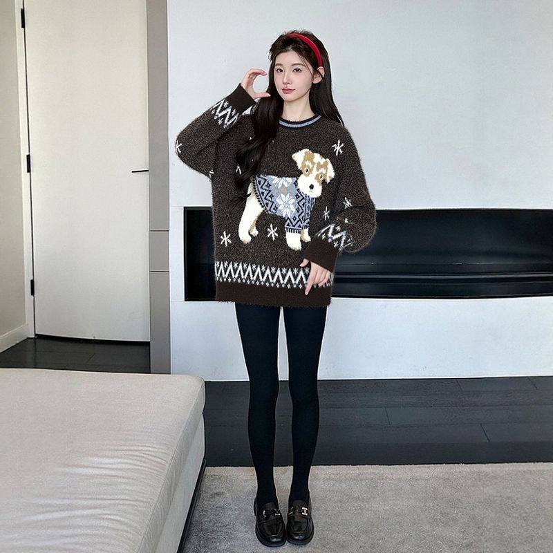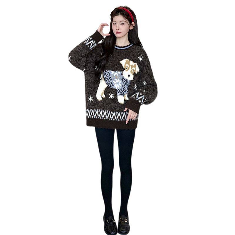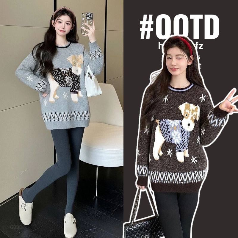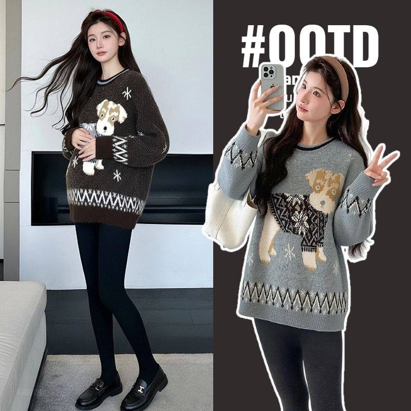 婧麒孕妇毛衣复古小狗提花毛衣女秋冬宽松圆领针织衫上衣潮