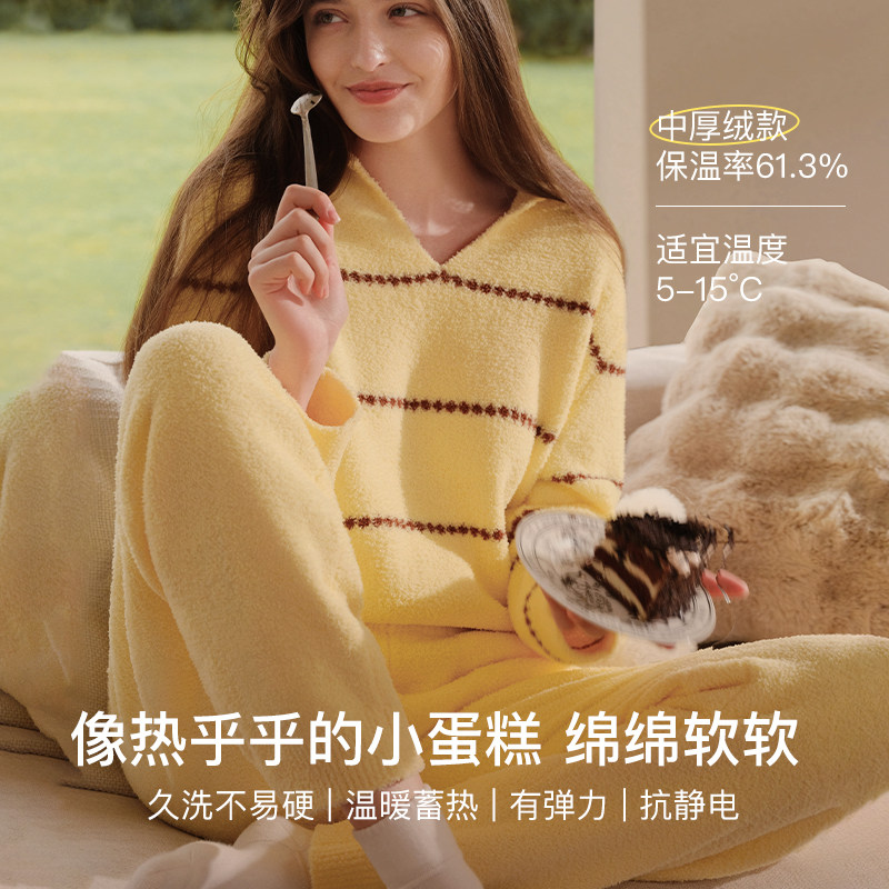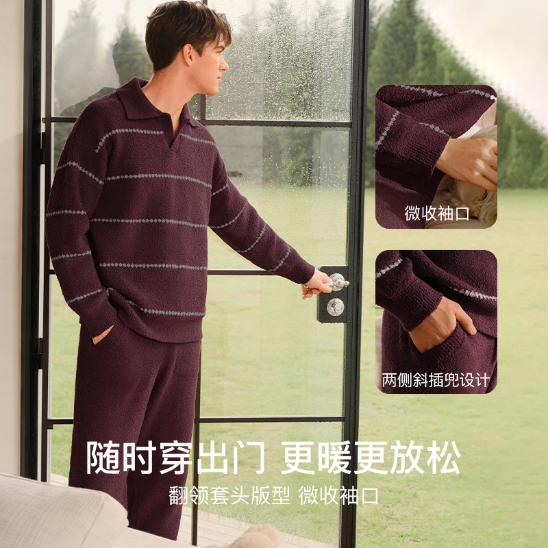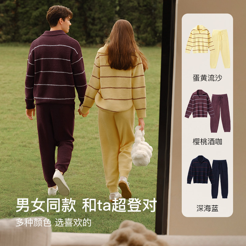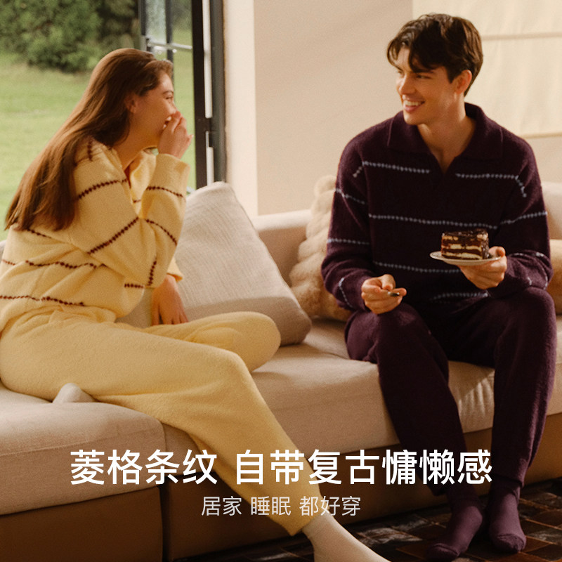 ubras贴贴系列|半边绒睡衣家居服条纹情侣套装女男款慕斯绒秋冬新
