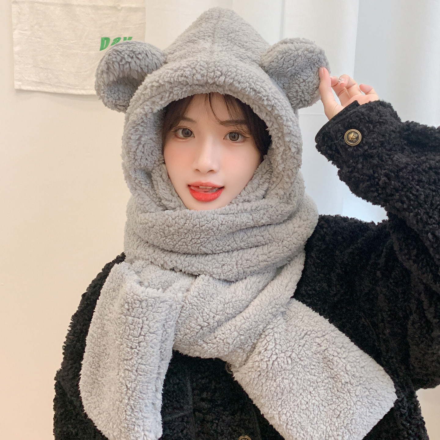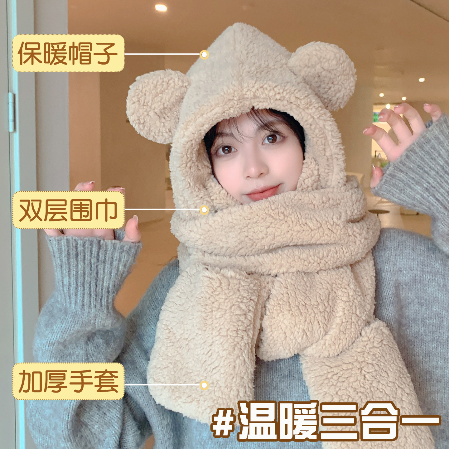 围巾帽子手套一体女连帽冬季帽可爱保暖围脖毛绒冬天三件套厚防寒