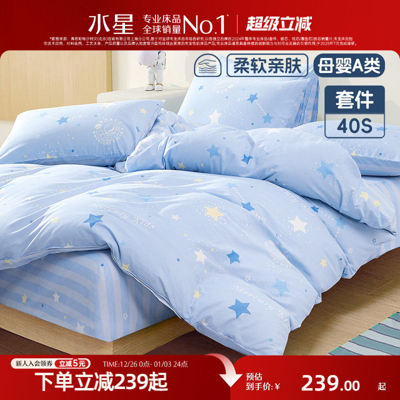 水星家纺全棉三/四件套A类套件儿童卡通学生宿舍床笠纯棉床单被套