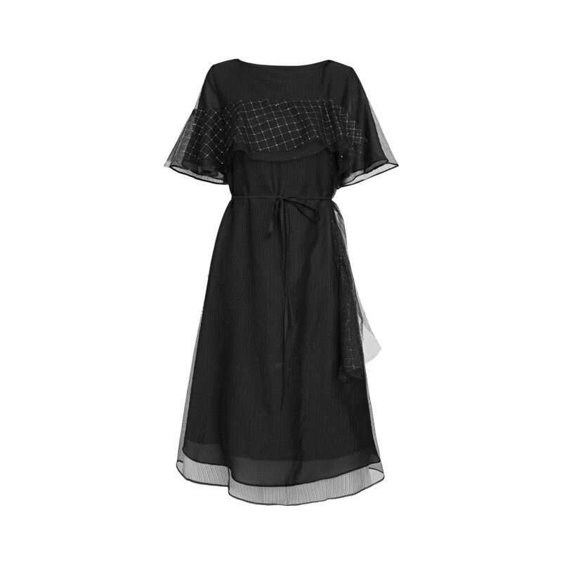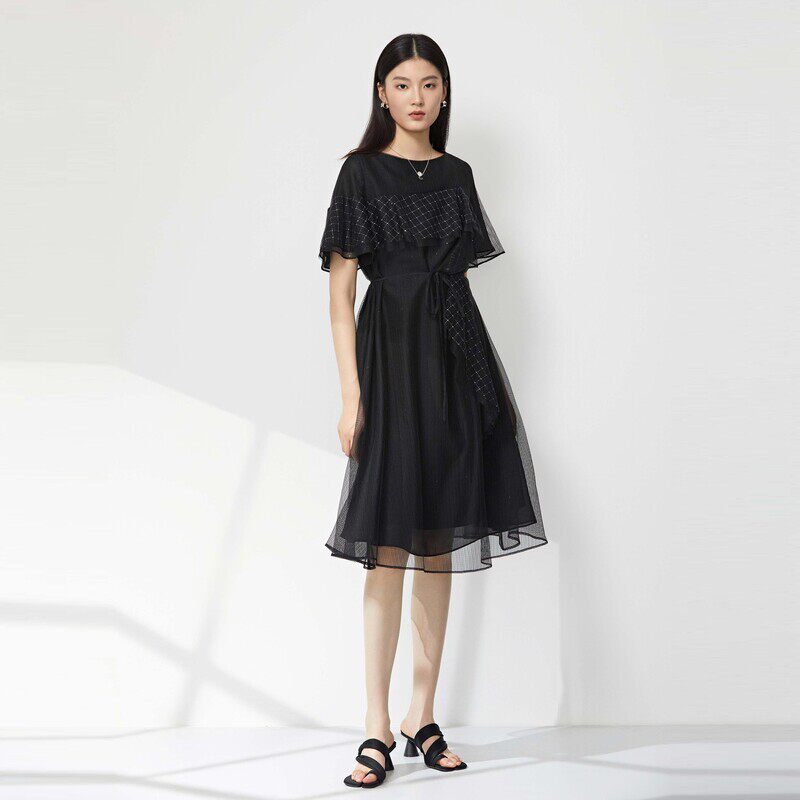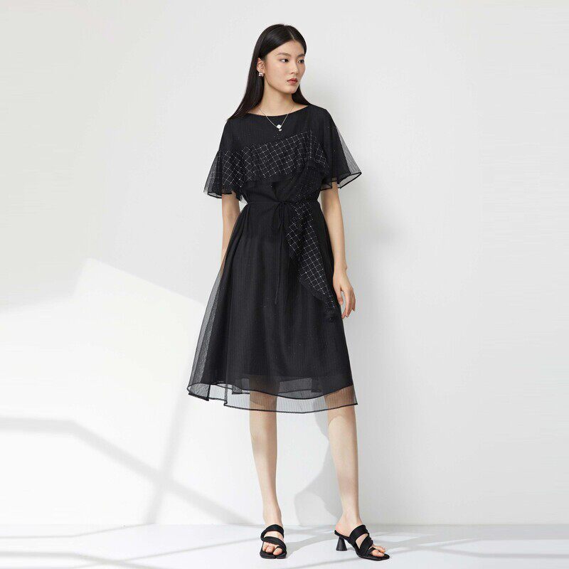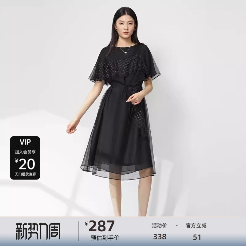【新品上新】sdeer圣迪奥圆领格纹收腰网纱短袖连衣裙S23281212